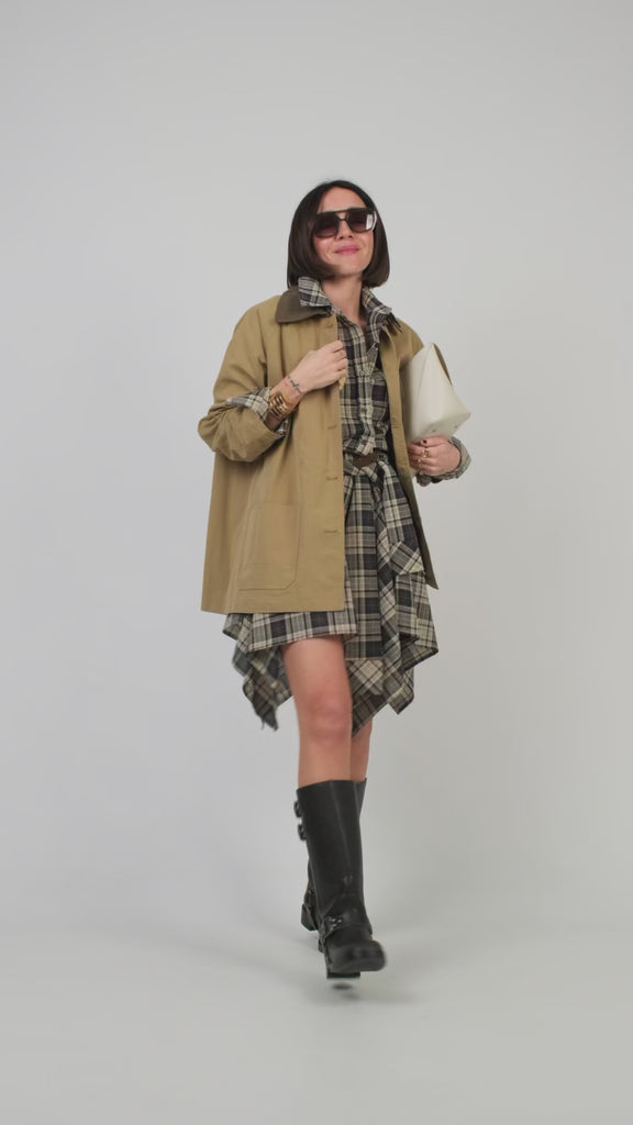 Giacca stile workwear in misto cotone. Colletto a punta profilato in tessuto a contrasto cromatico. Maniche ampie con spalla scesa. Abbottonatura frontale con bottoni effetto corno. Taschino sul petto e...