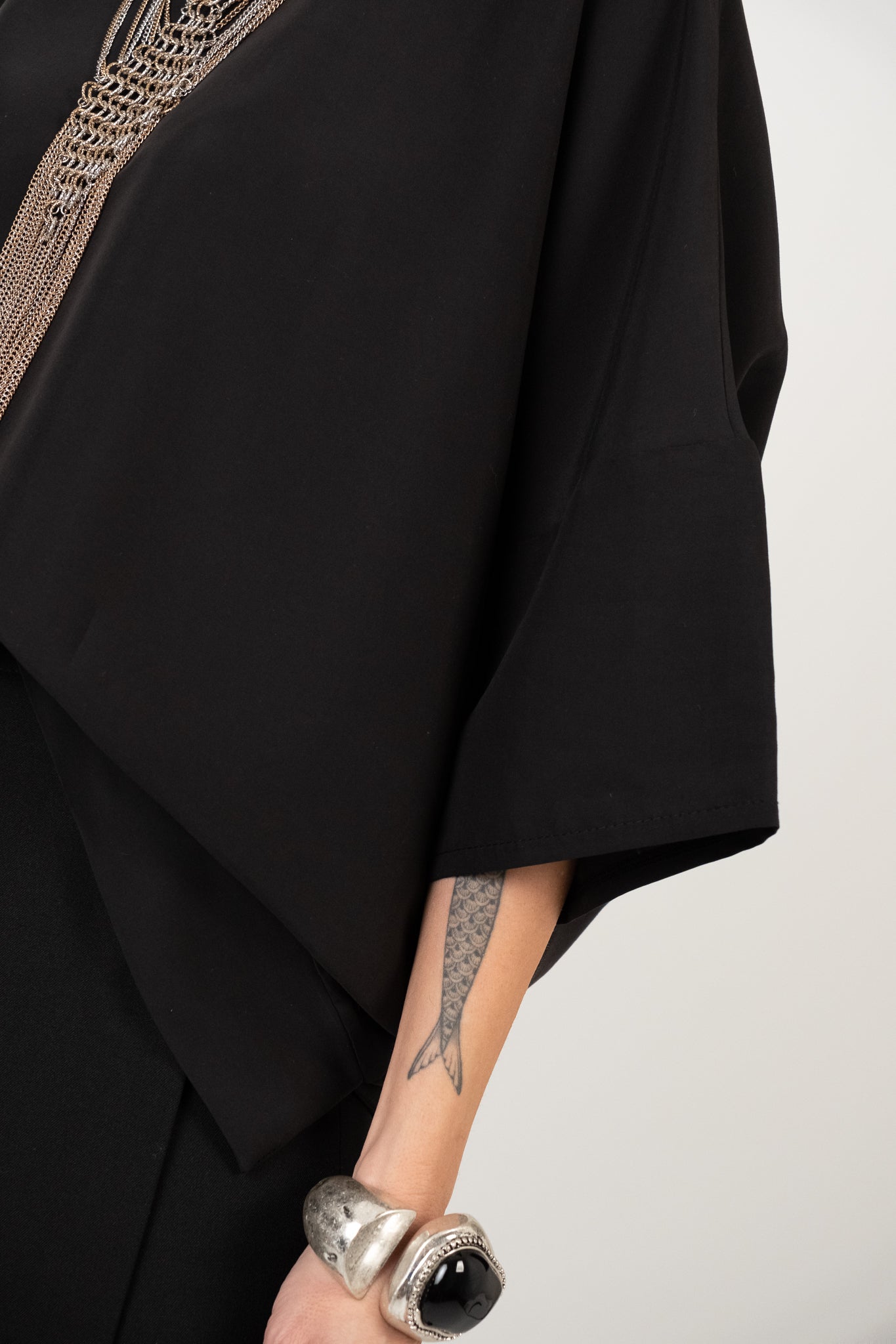 Blusa oversize in viscosa collo ampio a barca. Vestibilità rilassata e morbida. Linea boxy che si adatta a diverse fisicità. Maniche corte a kimono. Spacchi laterali. Texture morbida opaca.