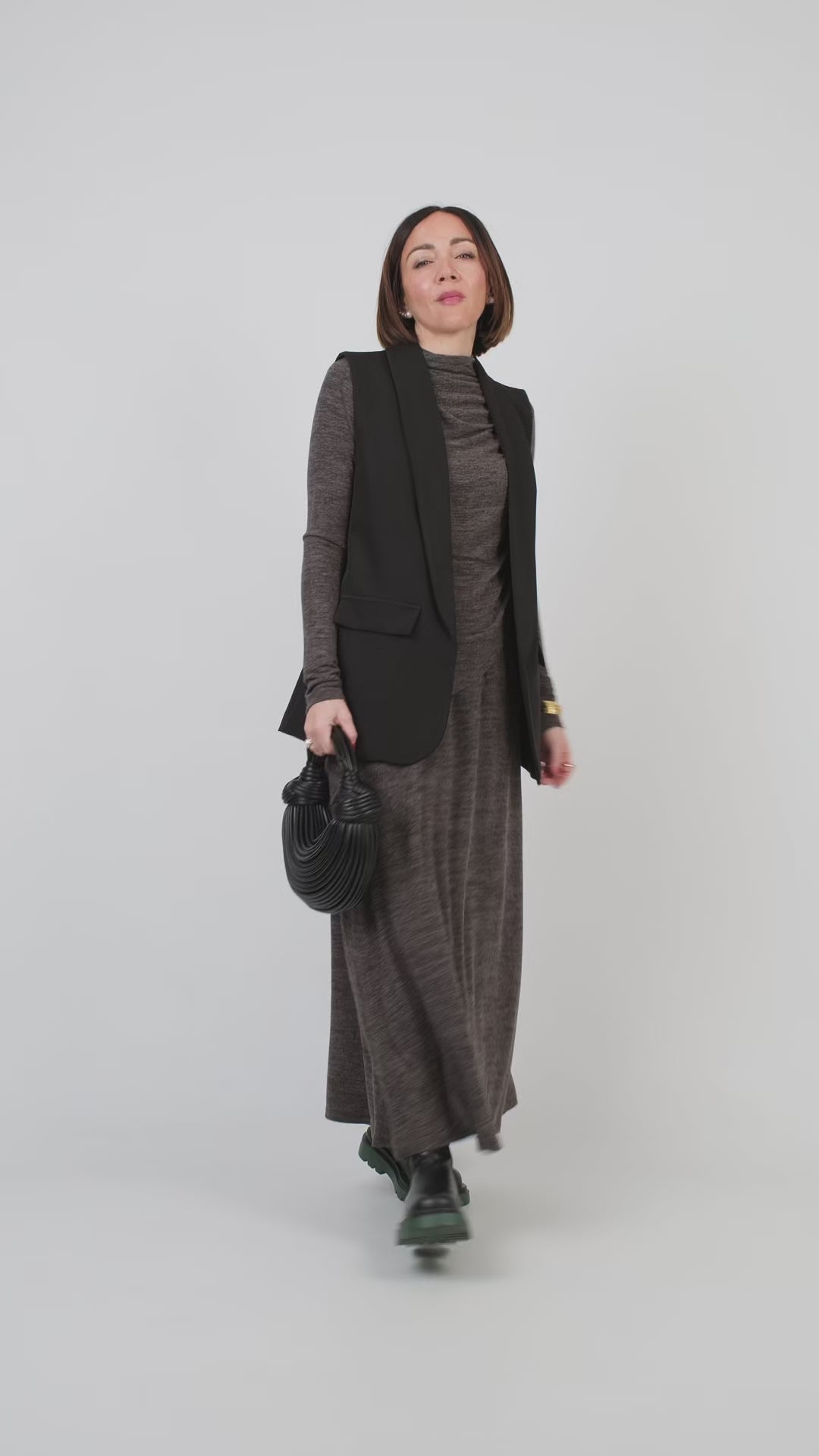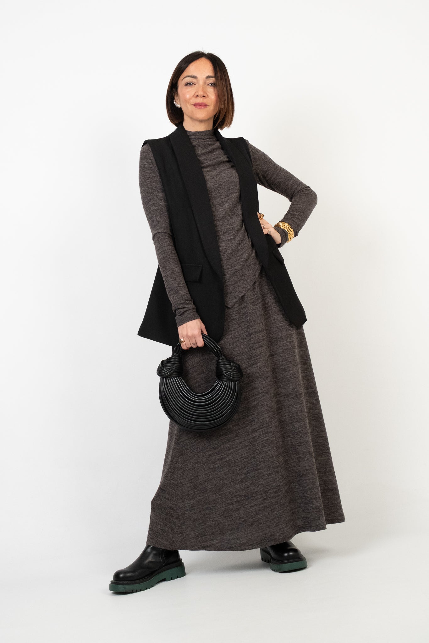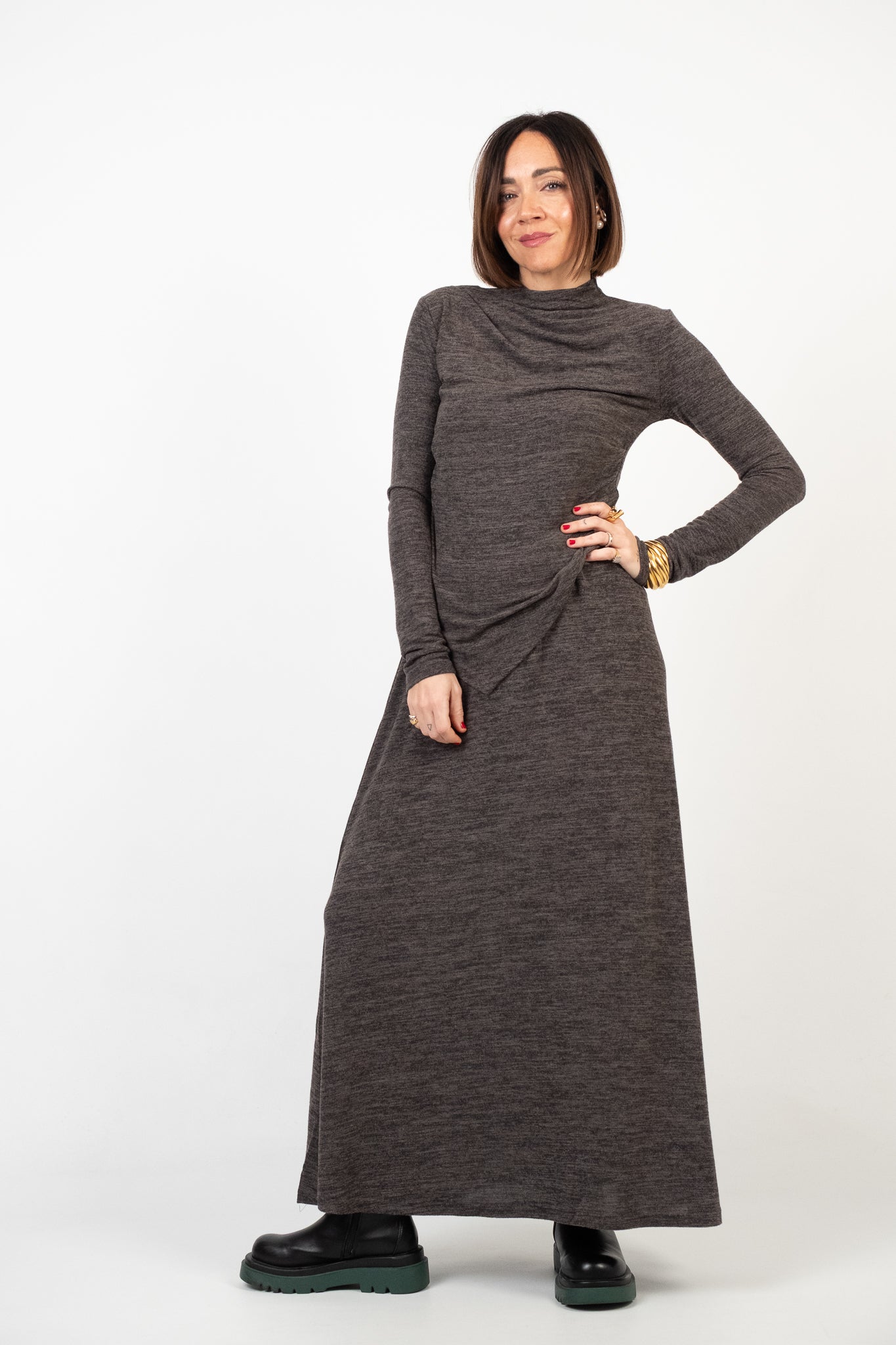Lile's tip: gli anfibi donano carattere al look, creando un elegante contrasto con la linea fluida dell’abito. Completa l’insieme con un cappotto lungo e una borsa essenziale per un risultato raffinato e versatile.