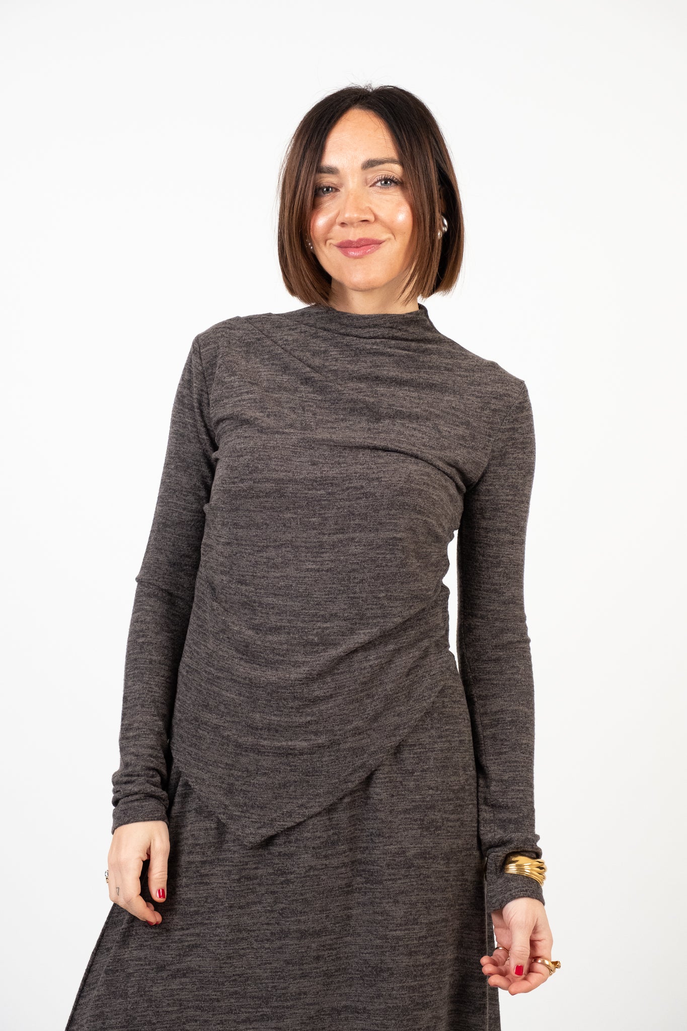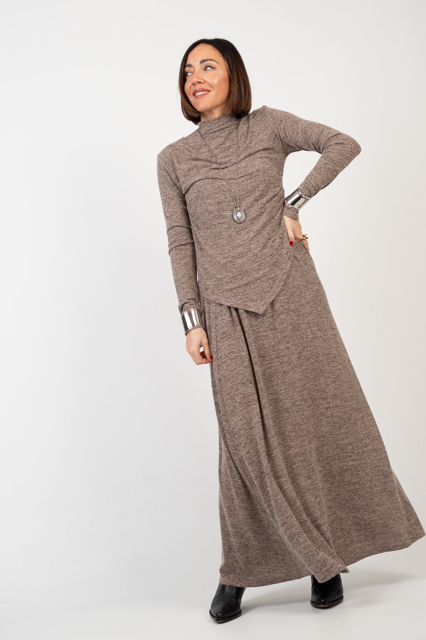Completo due pezzi con gonna in maglia leggera dal design essenziale e contemporaneo. Manica lunga con collo morbido drappeggiato, caratterizzata da una linea irregolare nella parte inferiore che crea movimento. Vestibilità regolare. Gonna lunga, linea pulita e svasata che accompagna la silhouette con eleganza. Taglio minimal e femminile. Tessuto morbido e confortevole, uniforme e leggermente elasticizzato, ideale per la mezza stagione. Lile indossa la taglia S.