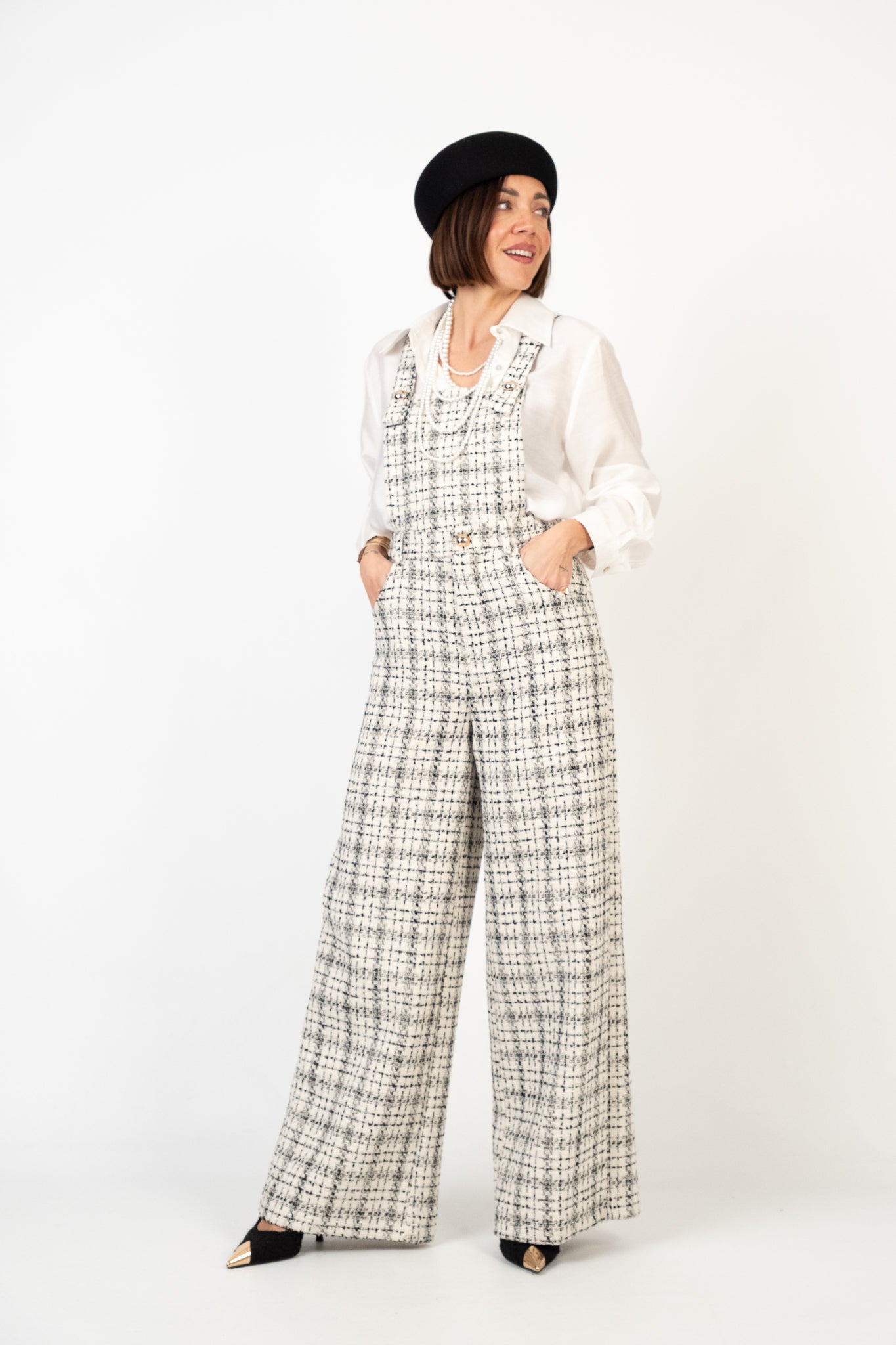 Salopette wide leg in tweed a quadri. Vestibilità regolare in vita e morbida lungo le gambe. Spalline regolabili incrociate a X sul retro. Chiusura con zip posteriore. Tasche laterali. Tessuto strutturato non elasticizzato. Lile indossa la taglia S.