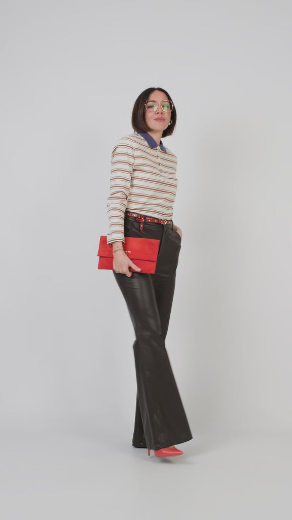 Pantalone effetto pelle modello flare. Interno spazzolato. Vita media. Patta frontale con zip nascosta e chiusura interna. Tasche laterali. Pesantezza media. Vestibilità confortevole e morbido al tatto. Lile indossa la taglia S.