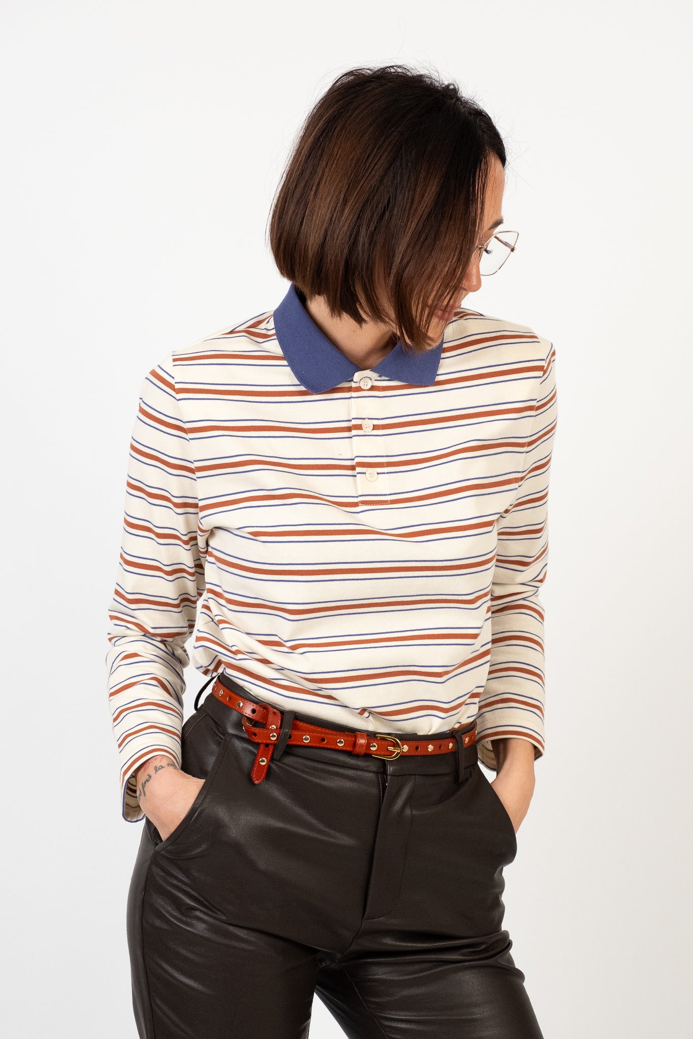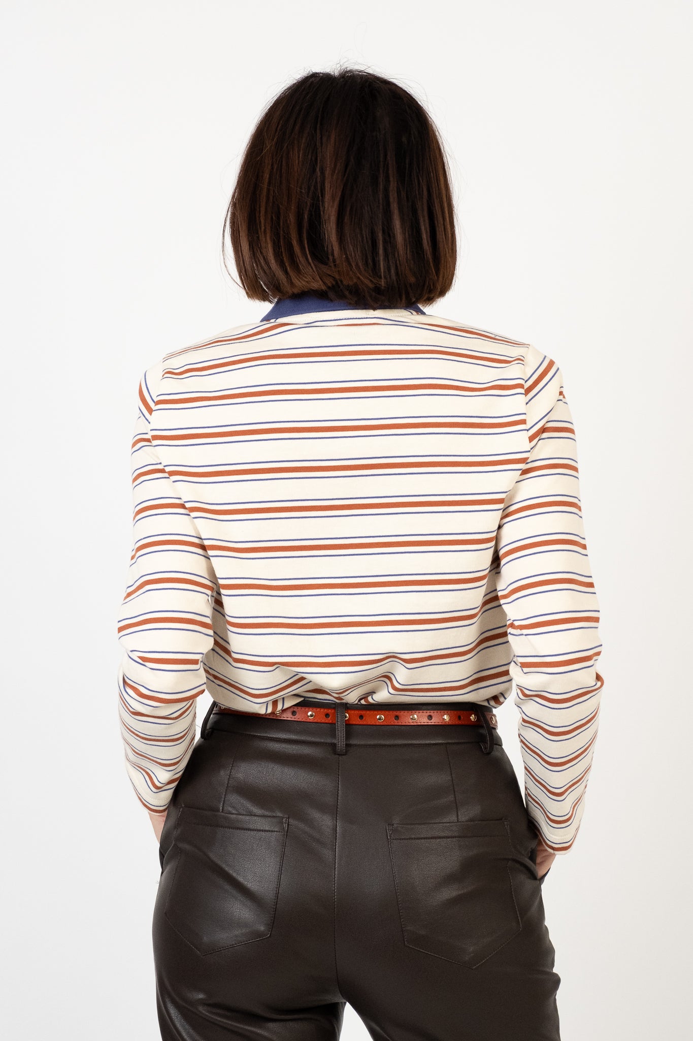 Polo a righe maniche lunghe con colletto a contrato stile rugby. Chiusura classica a tre bottoni. Vestibilità confortevole. Fondo regolare. Pesantezza media. Lile indossa la taglia S/M.