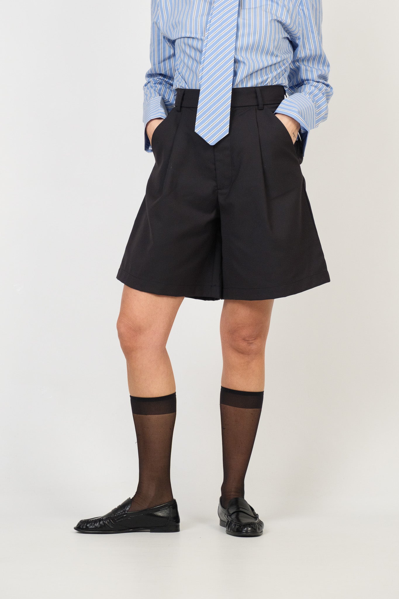 Bermuda blu navy con pence frontale e dal design moderno. Modello a vita alta con passanti in cintura, chiusura con zip e gancio a scomparsa e pratiche tasche laterali. Taglio svasato "A-line". Vestibilità confortevole che non segna. Tessuto non elasticizzato. Pesantezza media. Lile indossa la taglia S.