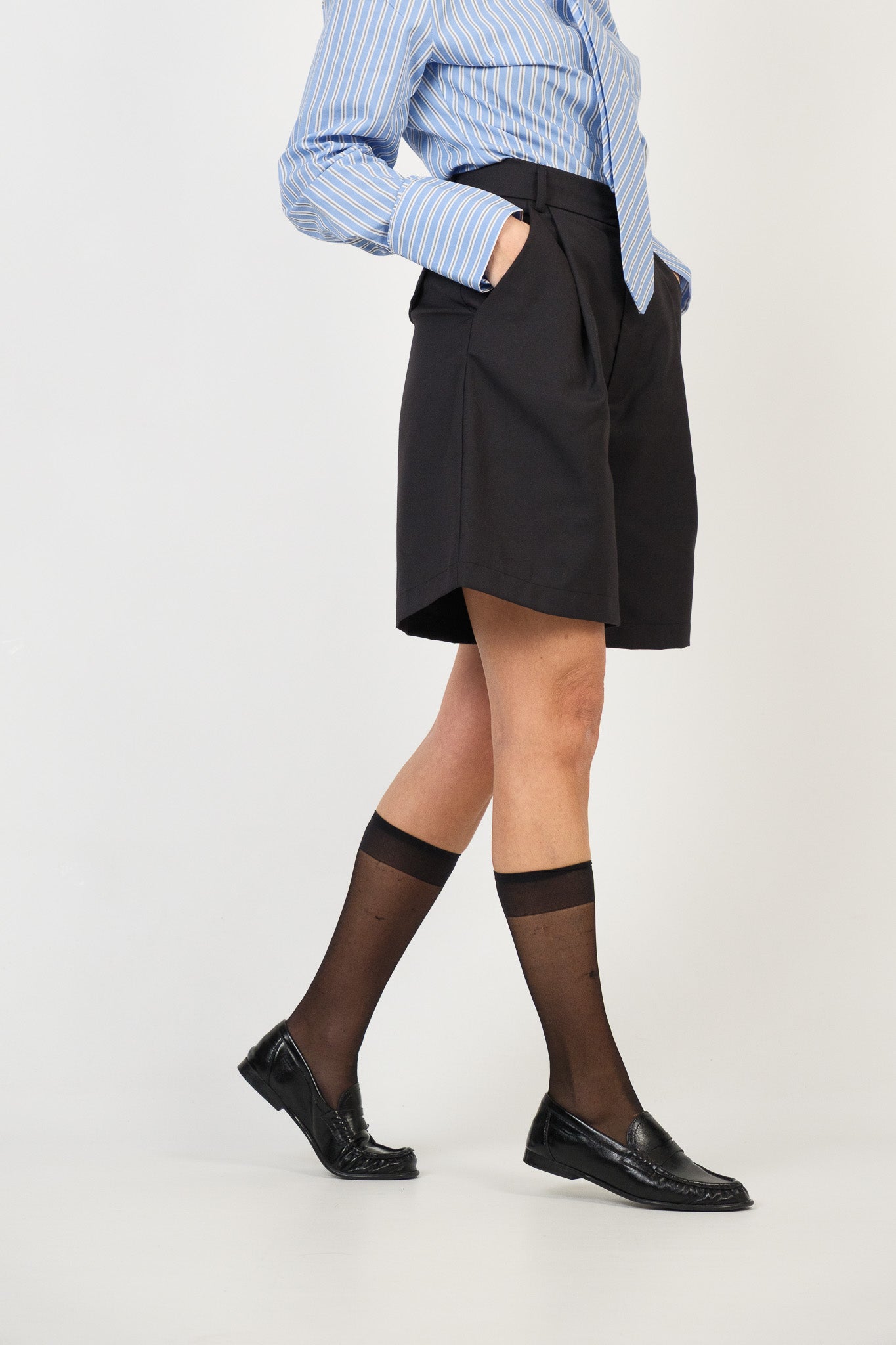 Lile's tip: abbina il bermuda a una polo in stile preppy a contrasto. Inseriscila all'interno dei pantaloni per definire la vita e valorizzare la silhouette. Completa l'outfit con un mocassino da barca per un tocco rilassato.