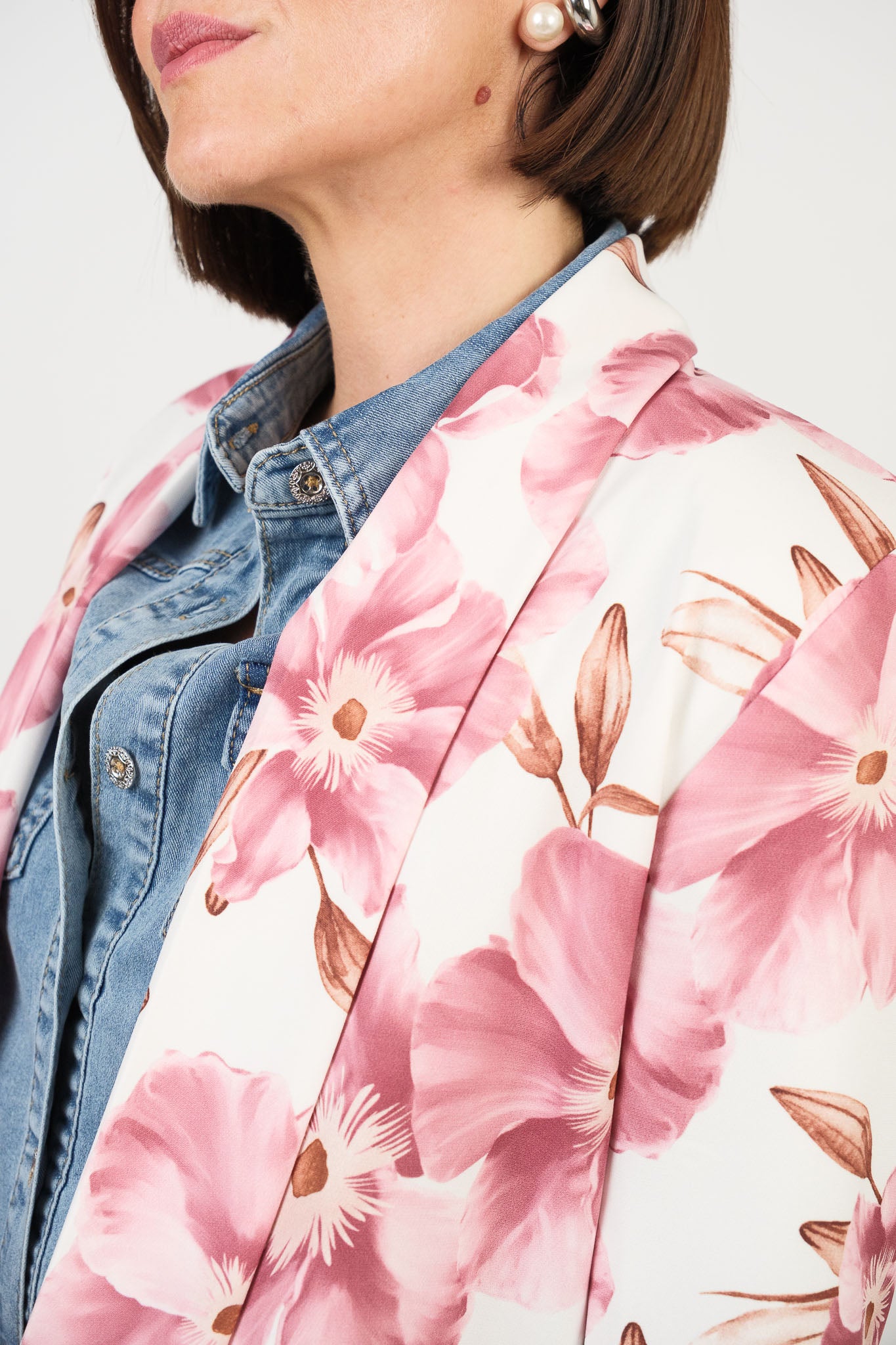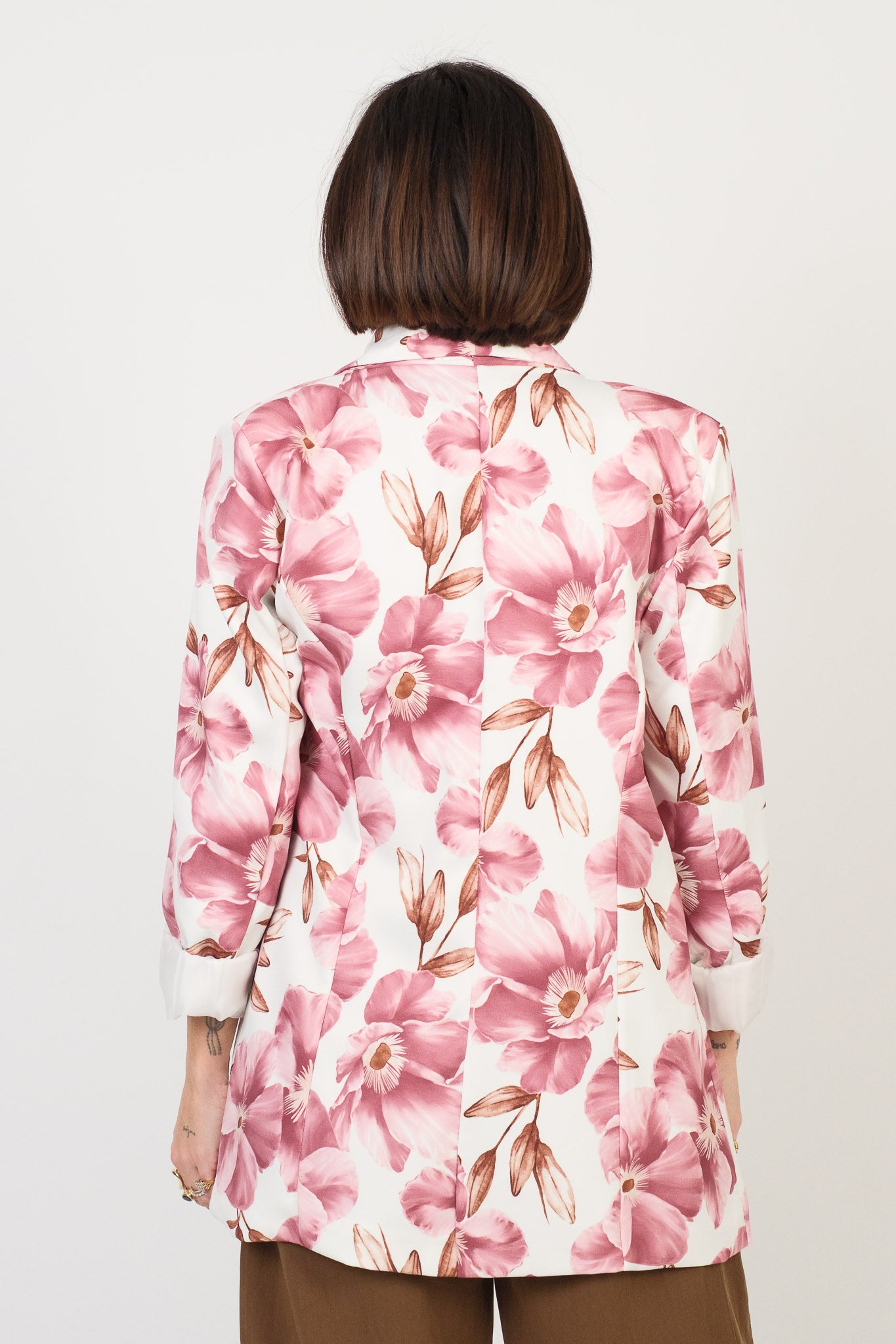 Blazer a fantasia floreale. Linea regolare e taglio moderno senza bottoni, ideale per una portabilità aperta e dinamica. Rever lungo e stondato. Spallina imbottita per un fit strutturato. Capo di leggera pesantezza, realizzato in tessuto non elasticizzato. Interno foderato per una vestibilità confortevole.