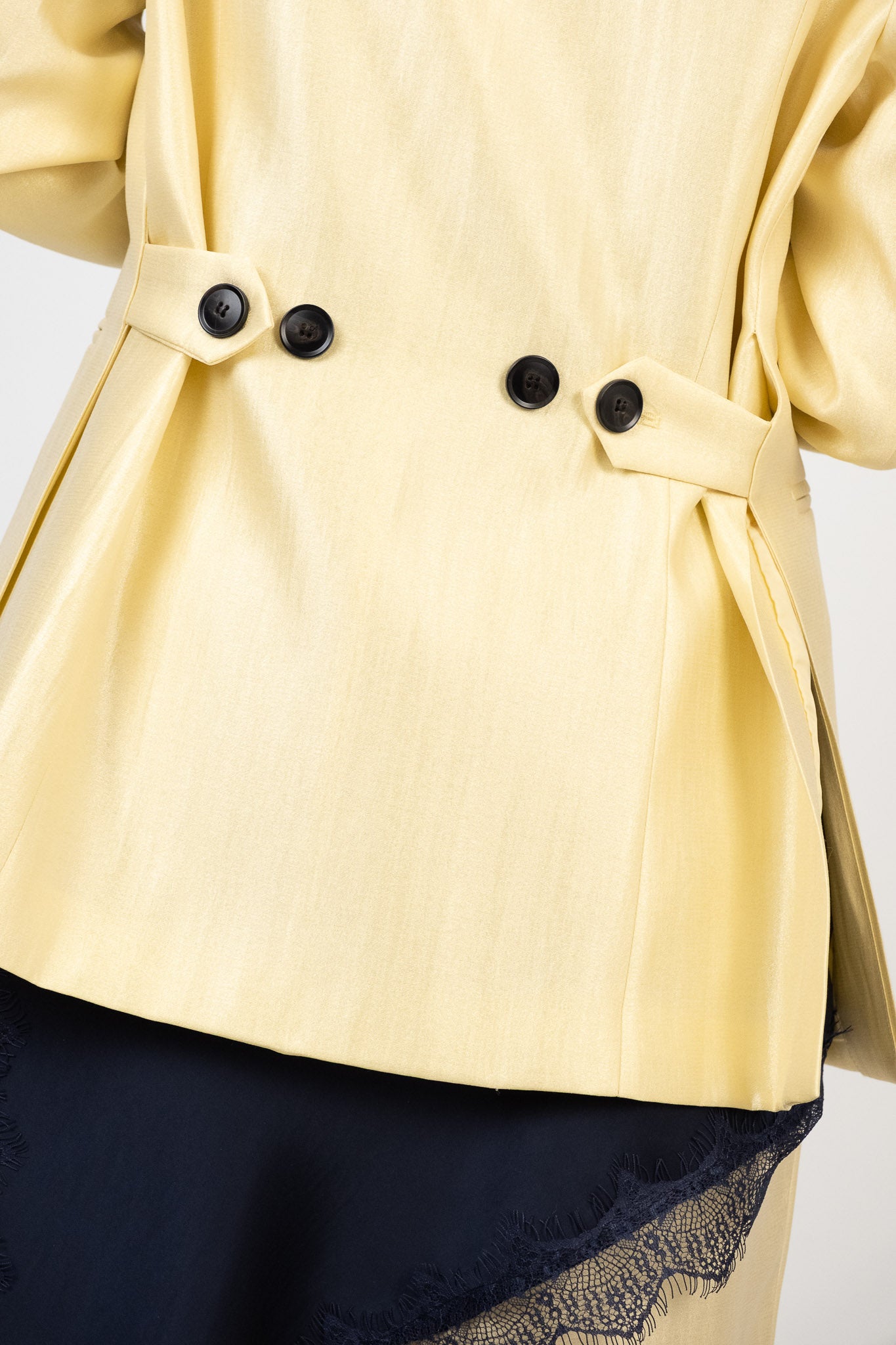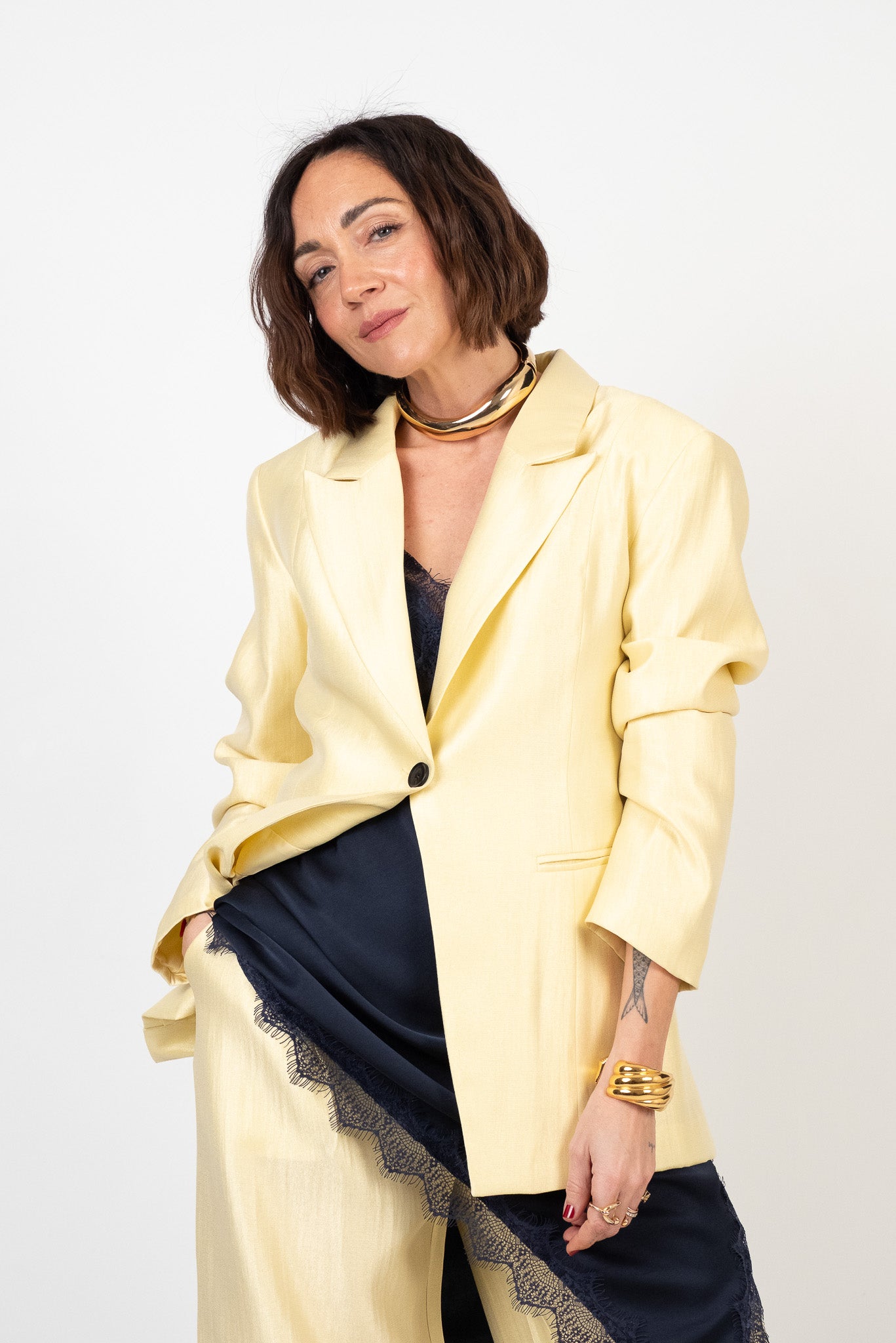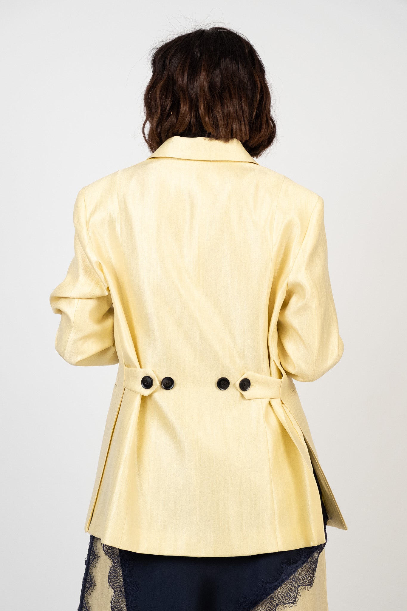 Blazer dal design moderno con doppia portabilità: regolare e morbida, sfiancata tramite doppio bottone sul retro per un effetto più o meno avvitato. Chiusura frontale regolare a due bottoni. Revers a punta di ispirazione couture. Taglio classico e strutturato. Pesantezza media, perfetto per le stagioni di transizione. Tessuto non elasticizzato, completamente foderato per un comfort superiore. Lile indossa la taglia S/M.