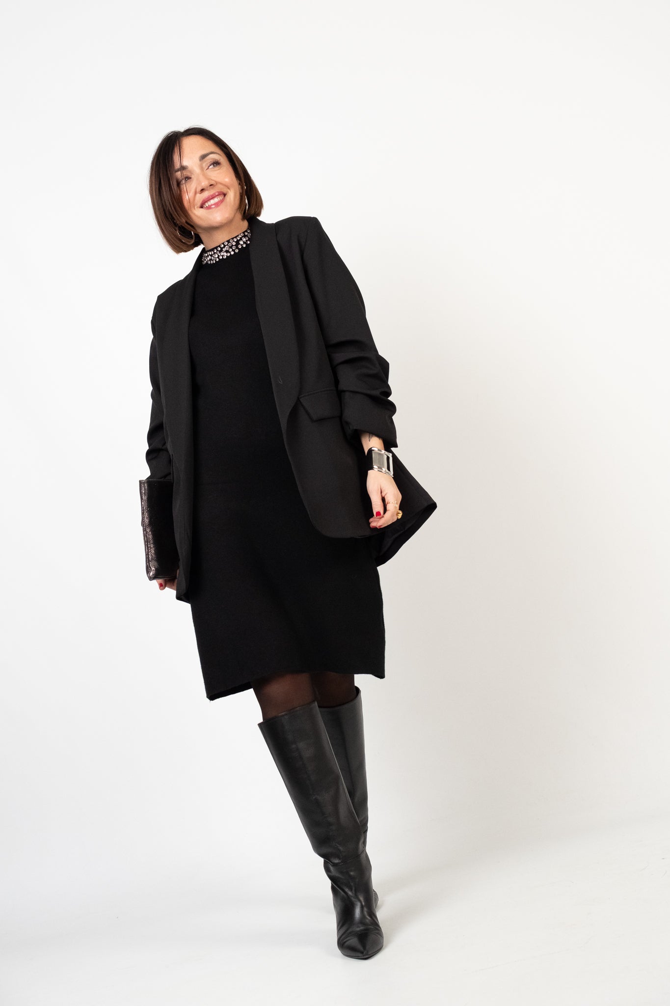 Blazer dal design contemporaneo in tessuto sostenuto, caratterizzato da una linea pulita e femminile. Vestibilità regolare senza chiusura. Revers classico a lancia, maniche arricciate leggermente corta.Taglio sfiancato che valorizza la silhouette. Spalle imbottite e morbide. Interno foderato. Tasche sul davanti finte. Lunghezza regolare. Pesantezza medi. Tessuto non elasticizzato.