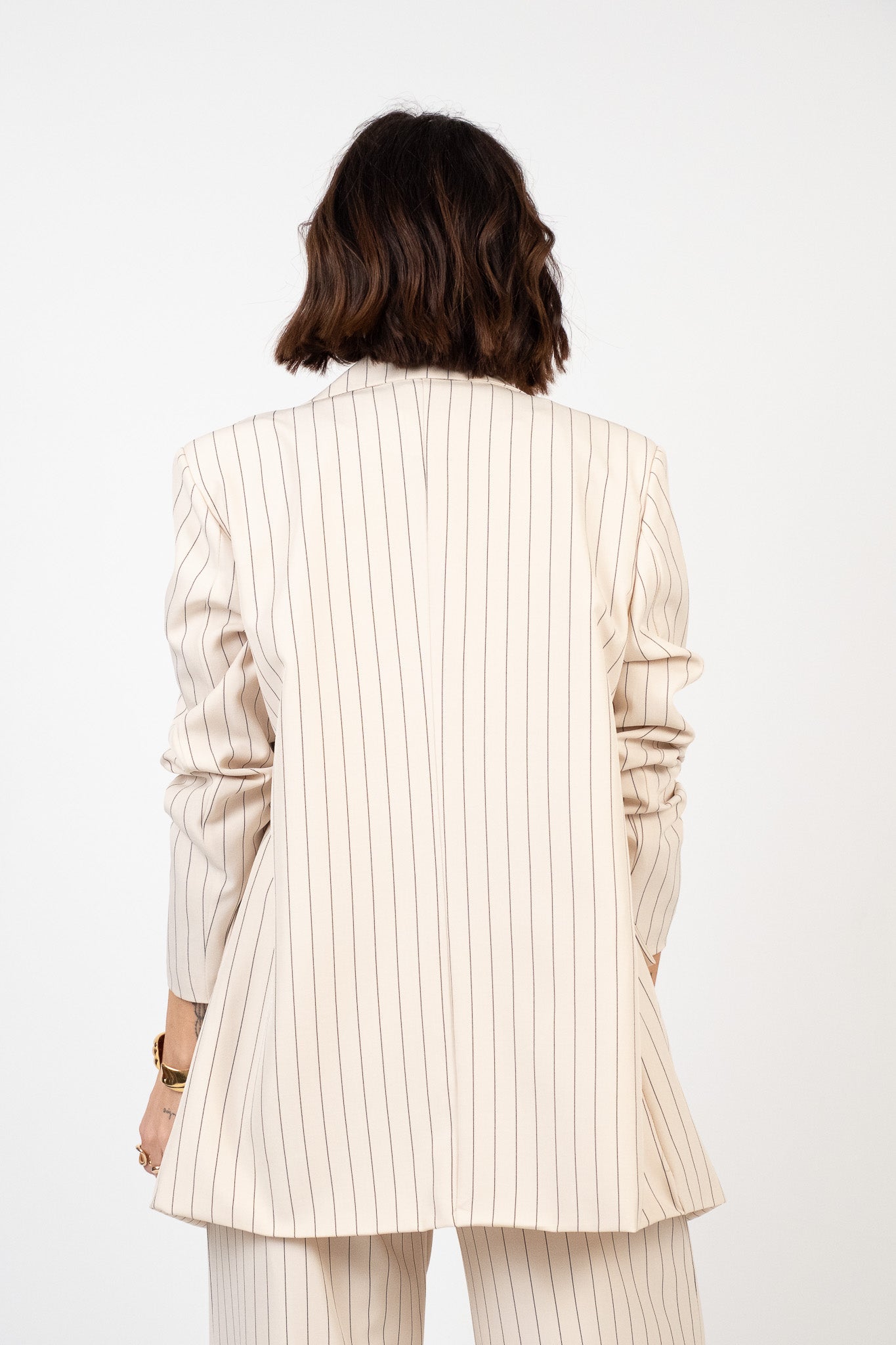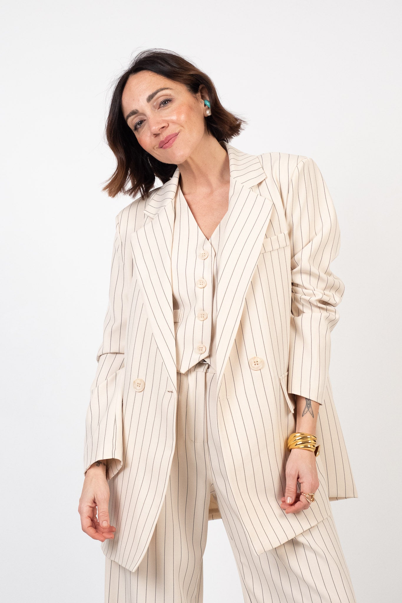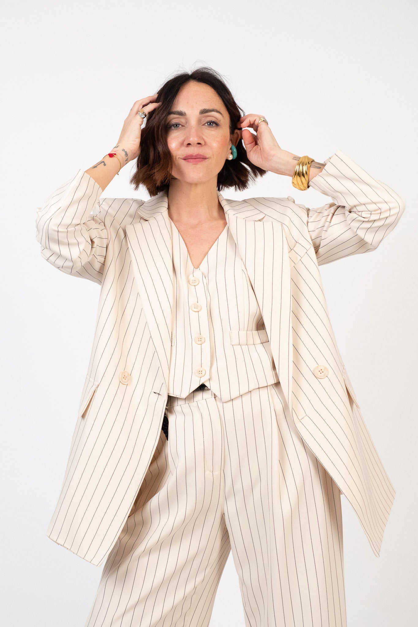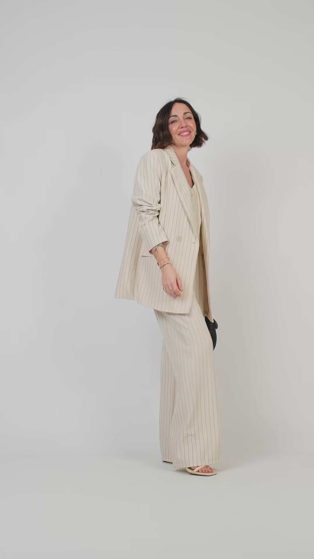 Blazer dal taglio sartoriale. Regular fit e fantasia gessata. Design strutturato con ampi revers a lancia e chiusura doppiopetto. Maniche lunghe e lineari. Il fit rilassato garantisce comfort e una vestibilità fluida.