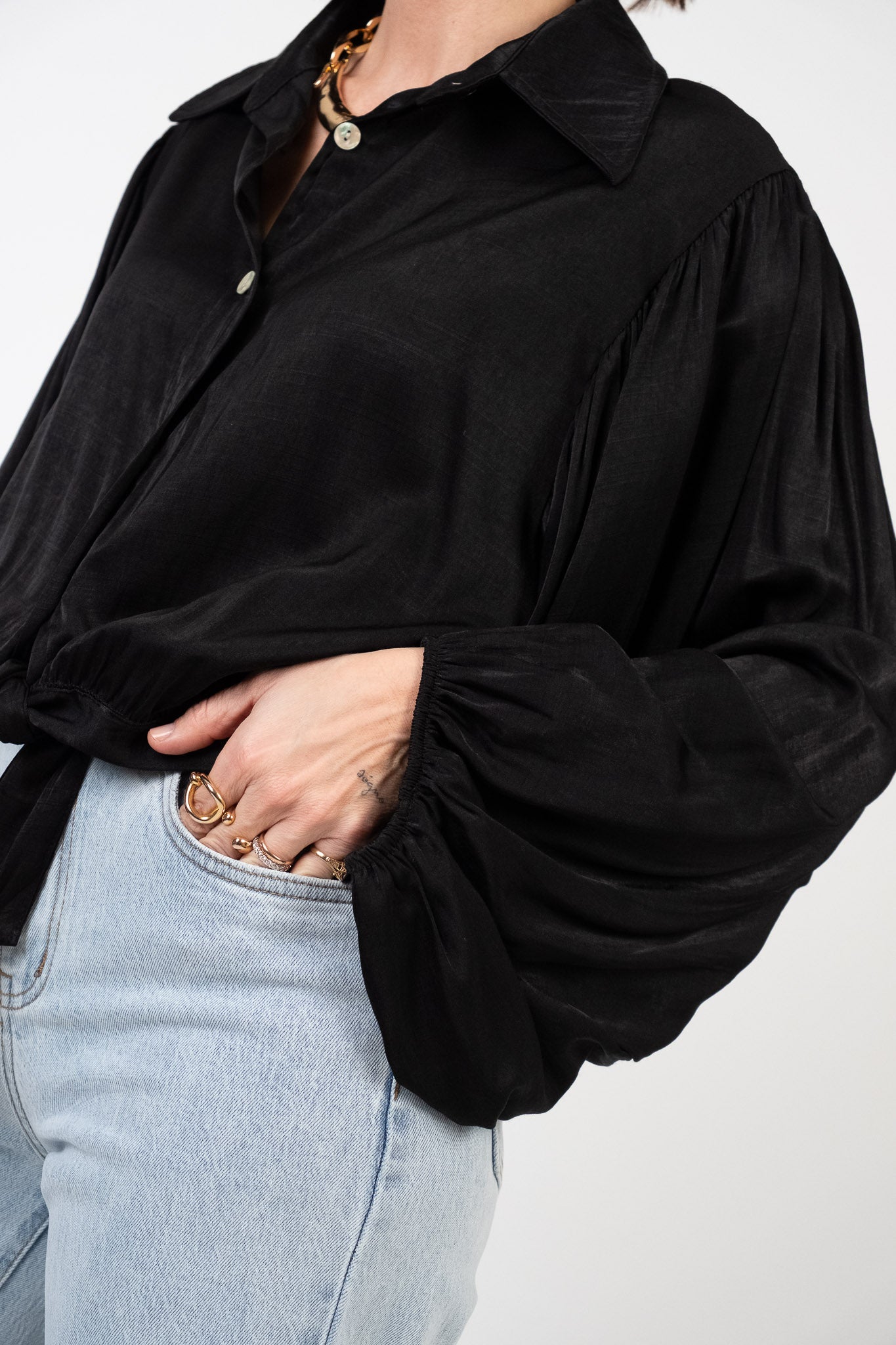 Blusa in satin morbida lungo i fianchi. Collo a vela ampio e bottoni a contrasto. Taglio regular sul busto con maniche "balloon" extra volume e polsini arricciati. Spalline naturali. Pesantezza leggera, tessuto fluido dalla lucentezza setosa e mano scivolata. Interno non foderato. Tessuto non elasticizzato.