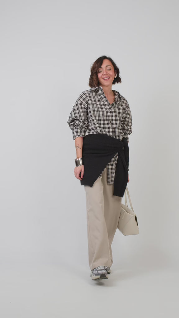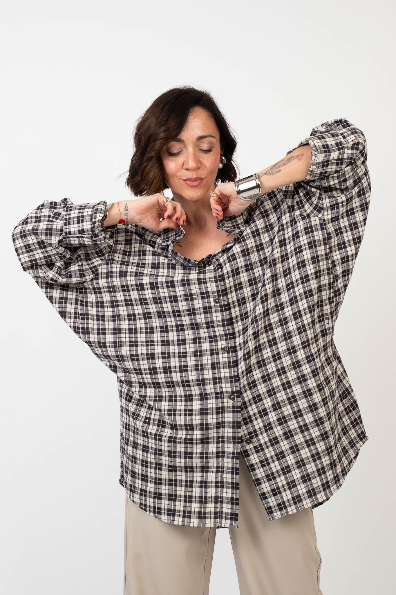 Camicia oversize dalla linea rilassata, ideale per un look stratificato. Chiusura frontale con bottoni, colletto classico a punta. Maniche ampie con polsini alti. Cuciture laterali che creano un morbido drappeggio frontale. Tessuto dalla texture morbida e pesantezza media, perfetto per le stagioni di transizione. Capo non elasticizzato.