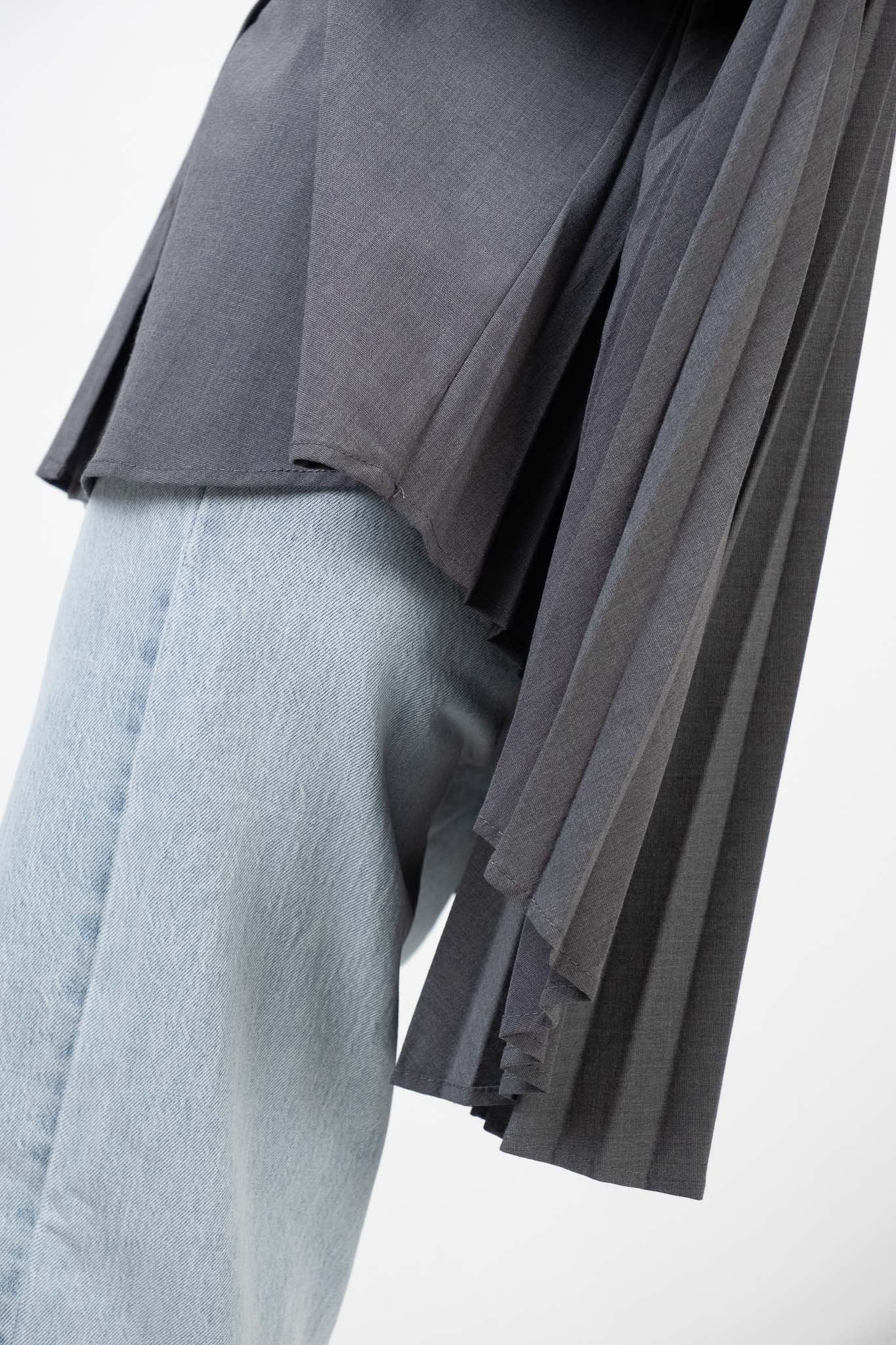 Camicia grigio antracite. Classica chiusura frontale con bottoni. Collo a vela proporzionato. Taglio ampio e squadrato con fondo asimmetrico più lungo sul retro. Spalline scese per accentuare il volume rilassato. Pesantezza media. Interno non foderato. Tessuto dalla mano ferma ma morbida, non elasticizzato. Retrò plissettano per un finish moderno.