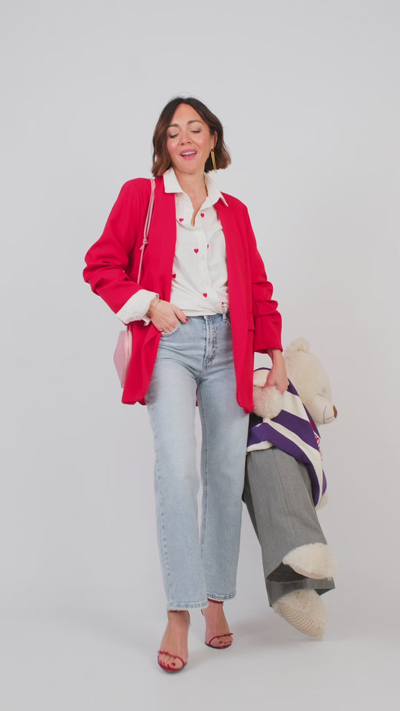 Camicia in cotone con cuori rossi ricamati sulla manica e sulla parte frontale. Colletto classico. Manica lunga con polsino basso. Chiusura frontale con bottoni bianchi. Design classico con vestibilità morbida. Lunghezza regolare. Texture leggera. Non elasticizzato.