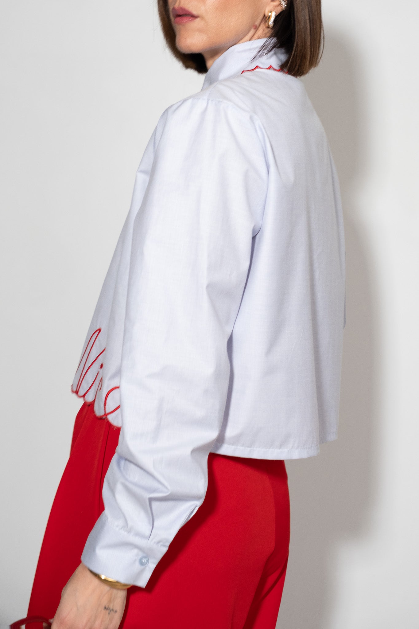Camicia con ricami smerlati a contrasto. Colletto a punta classico, impreziosito da un elaborato ricamo a motivo floreale. Taglio squadrato. Maniche lunghe dal taglio regolare con polsini alti a un bottone. Abbottonatura frontale con bottoni in nuance e ricamo calligrafico "Nice" posizionato sul fianco. Tessuto fresco, pesantezza media. Non elasticizzato.