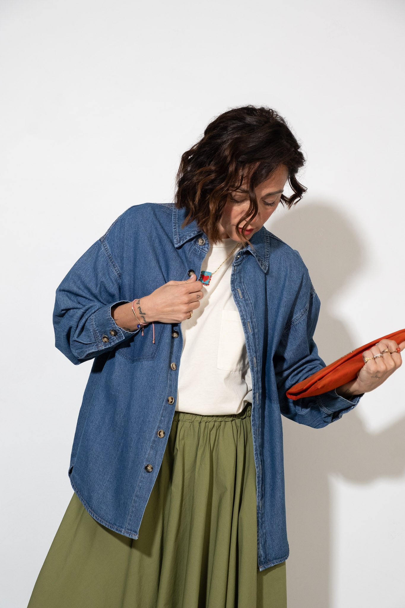 Lile's tip: per un tocco più grintoso, provala in un total look denim con jeans coordinati. Arrotola le maniche e aggiungi una borsa a mano dai toni caldi come l'arancio o il cuoio per creare un contrasto cromatico vibrante.