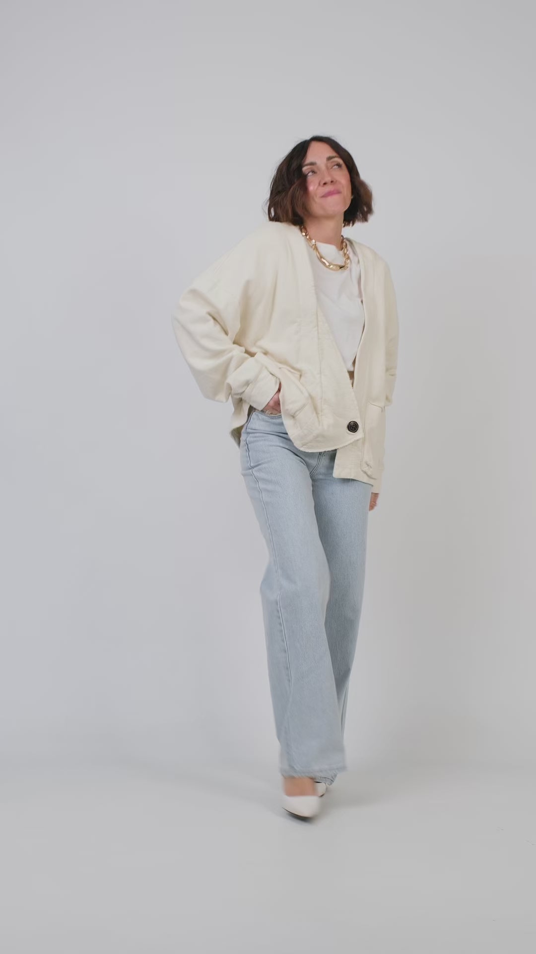 Cardigan in felpa di cotone dal design moderno con doppia portabilità: vestibilità ampia e aperta per un look rilassato, oppure incrociata e strutturata utilizzando il bottone a contrasto. Scollo a V profondo senza revers. Taglio over con fondo asimmetrico e bordi a taglio vivo. Spalline scese per un effetto morbido. Pesantezza media, ideale per il layering. Interno in cotone non garzato. Tessuto confortevole e non elasticizzato.