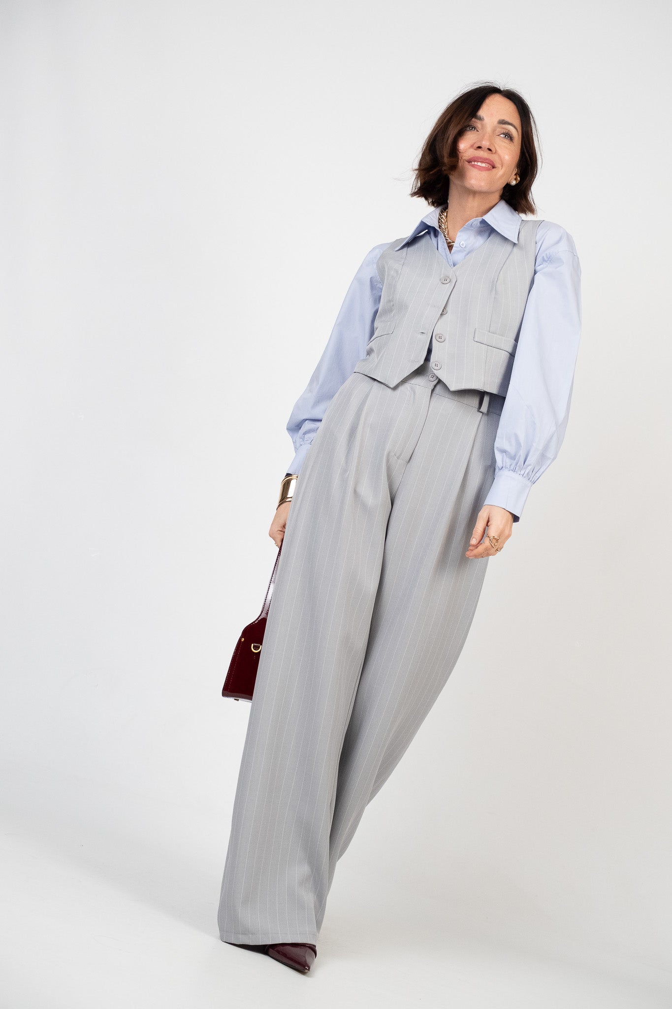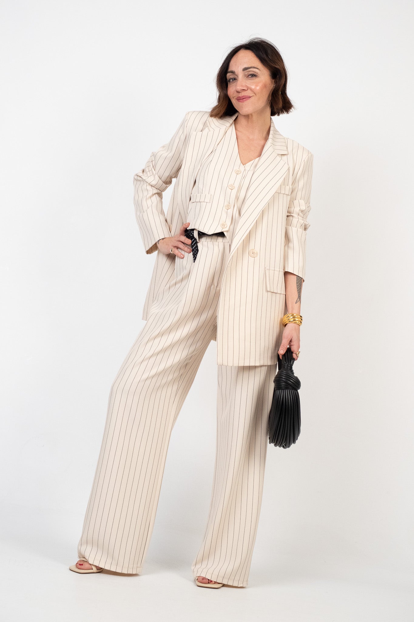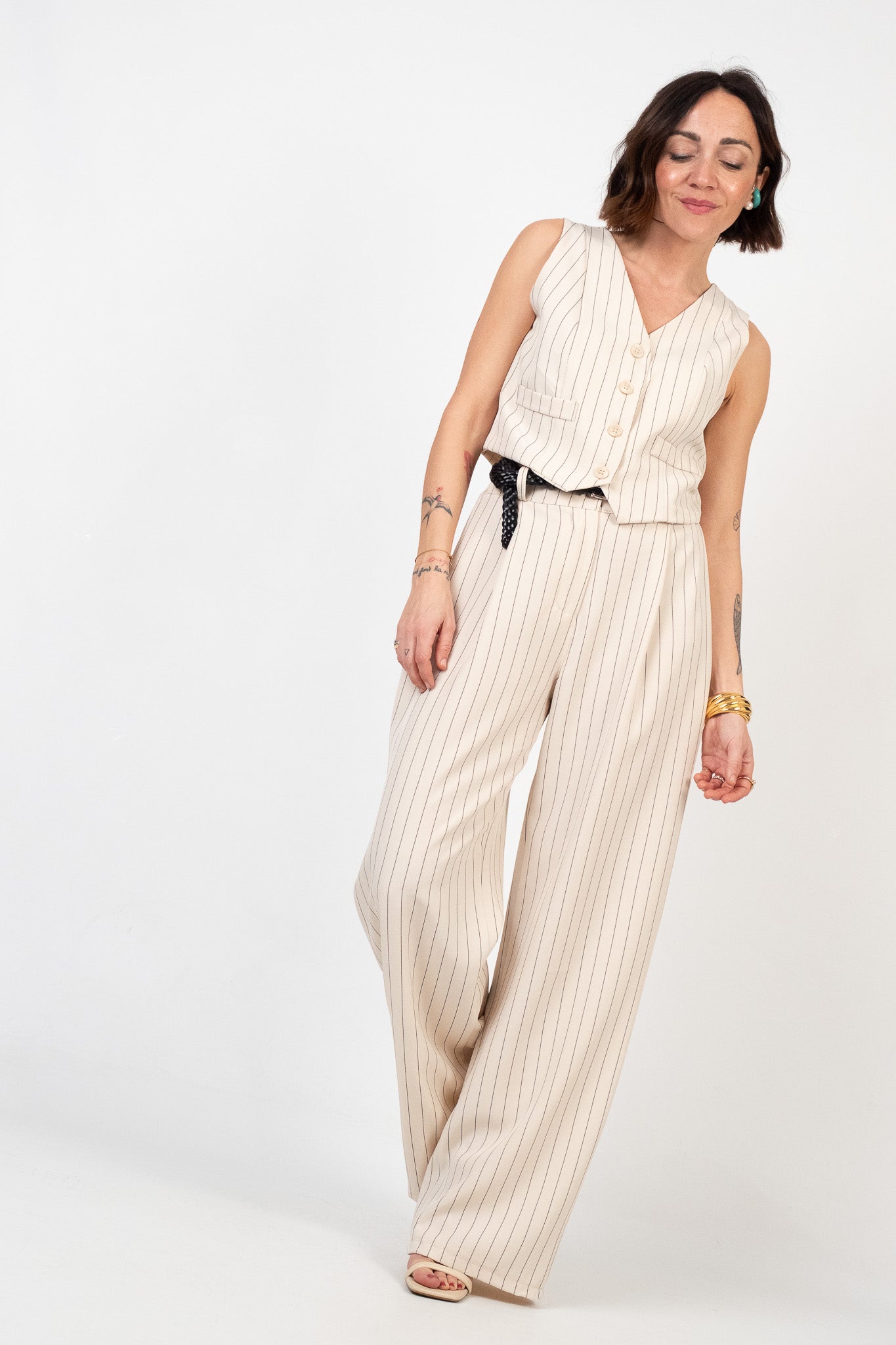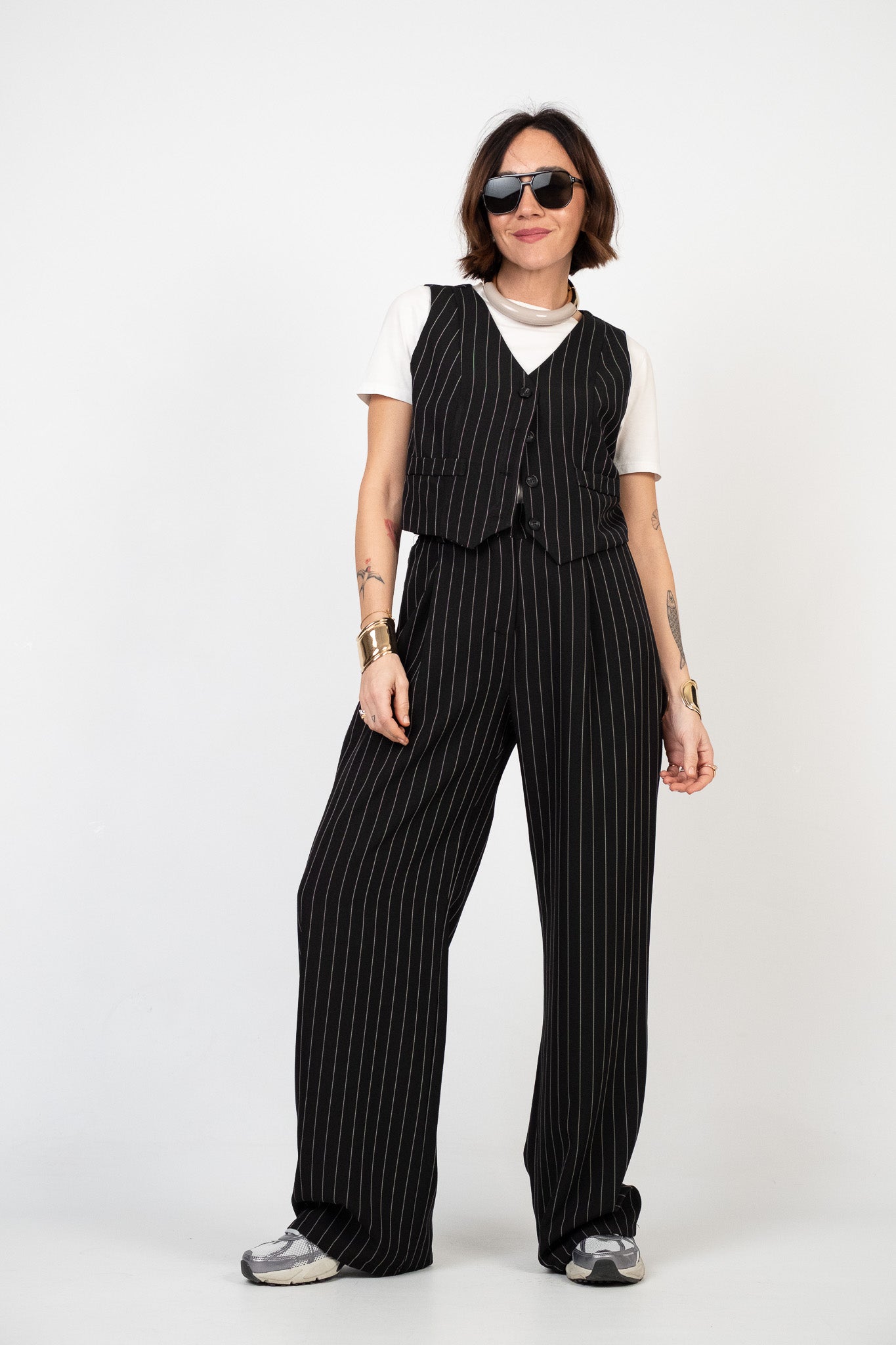 Lile's tip: la versatilità di questo coordinato ti permette di spezzarlo facilmente: puoi abbinare il gilet sopra un jeans denim a gamba dritta con sneaker per un tocco casual-chic, oppure abbina il pantalone a una t-shirt bianca infilata dentro e un chiodo in pelle per un look grintoso.