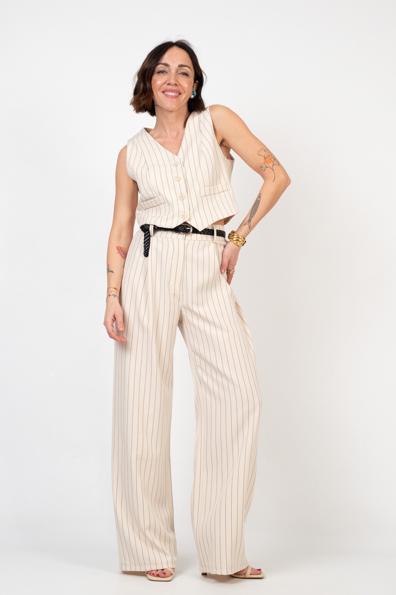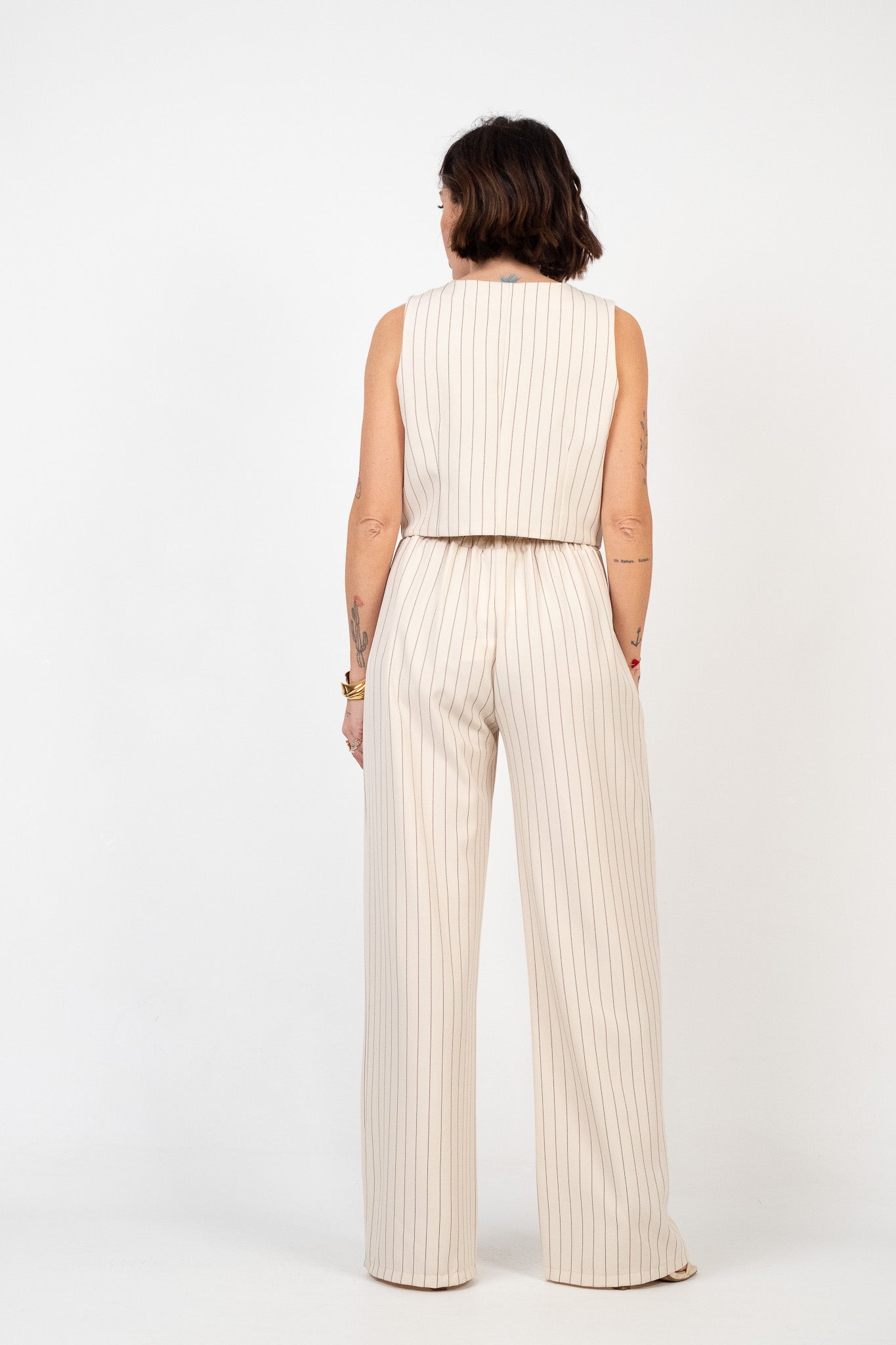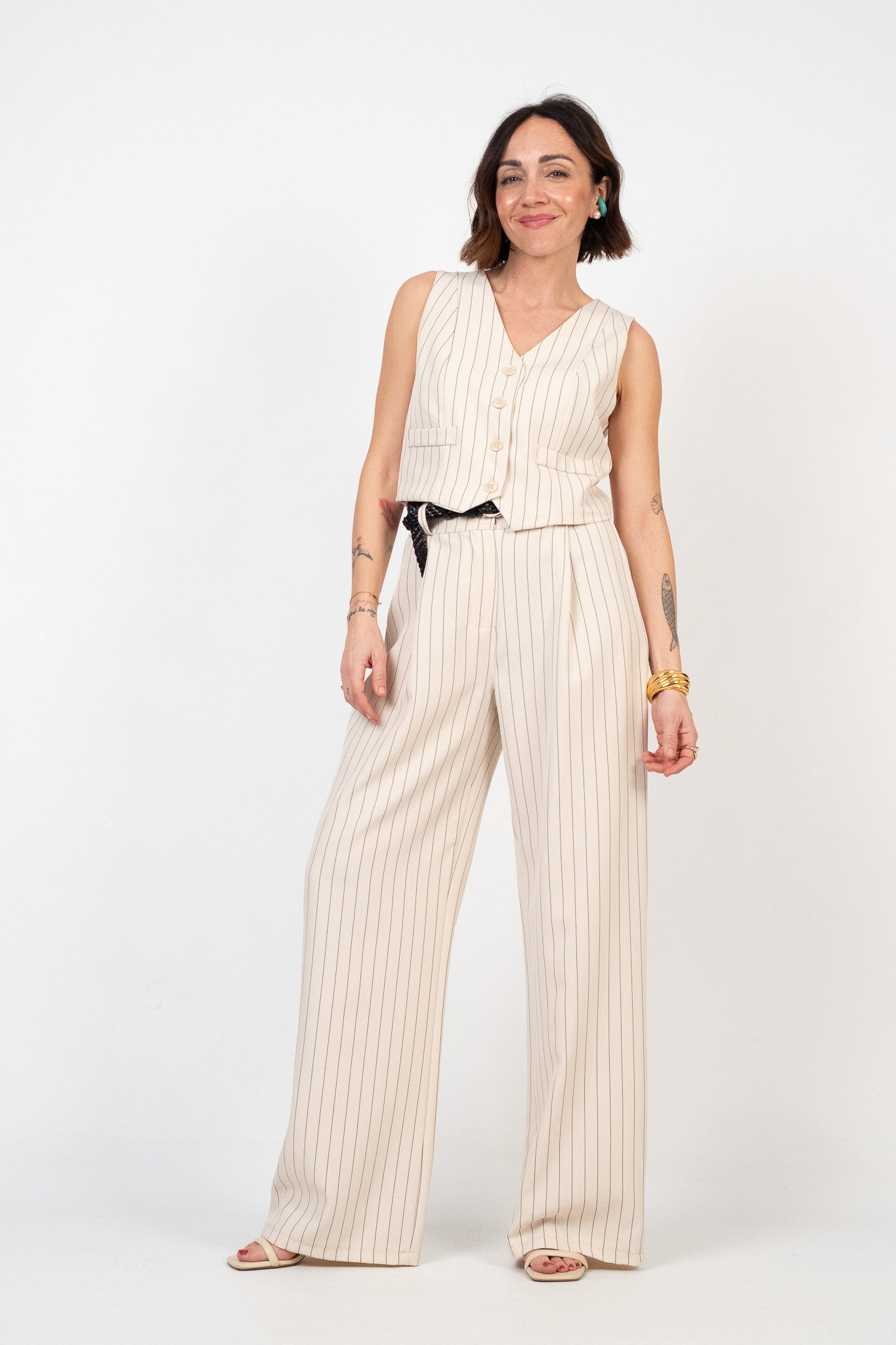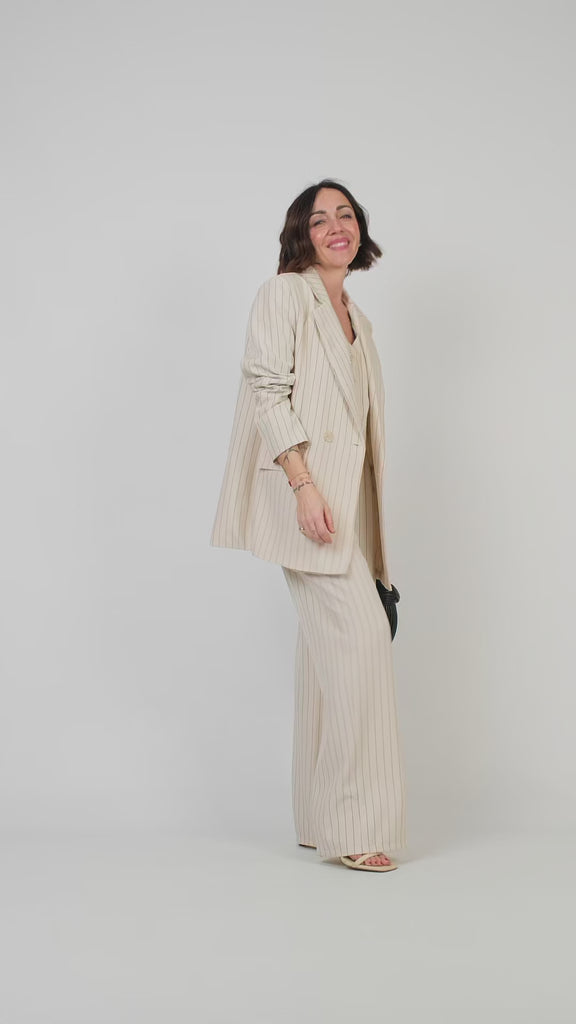 Set coordinato gilet e pantalone fantasia gessata. Gilet dal taglio cropped con scollo a V e chiusura frontale a quattro bottoni. Ha due finte tasche a filetto frontali. Il pantalone è a vita alta con gamba ampia e dritta. Tessuto leggero. Chiusura frontale con zip e bottone. Vita regolare con passanti e elastico sul retro. Il pantalone non è interamente foderato. Assenza di tasche.