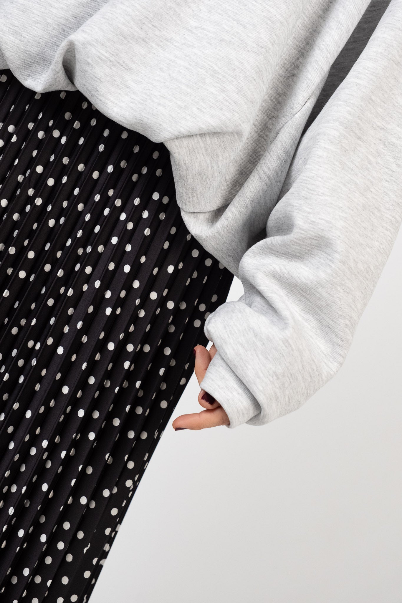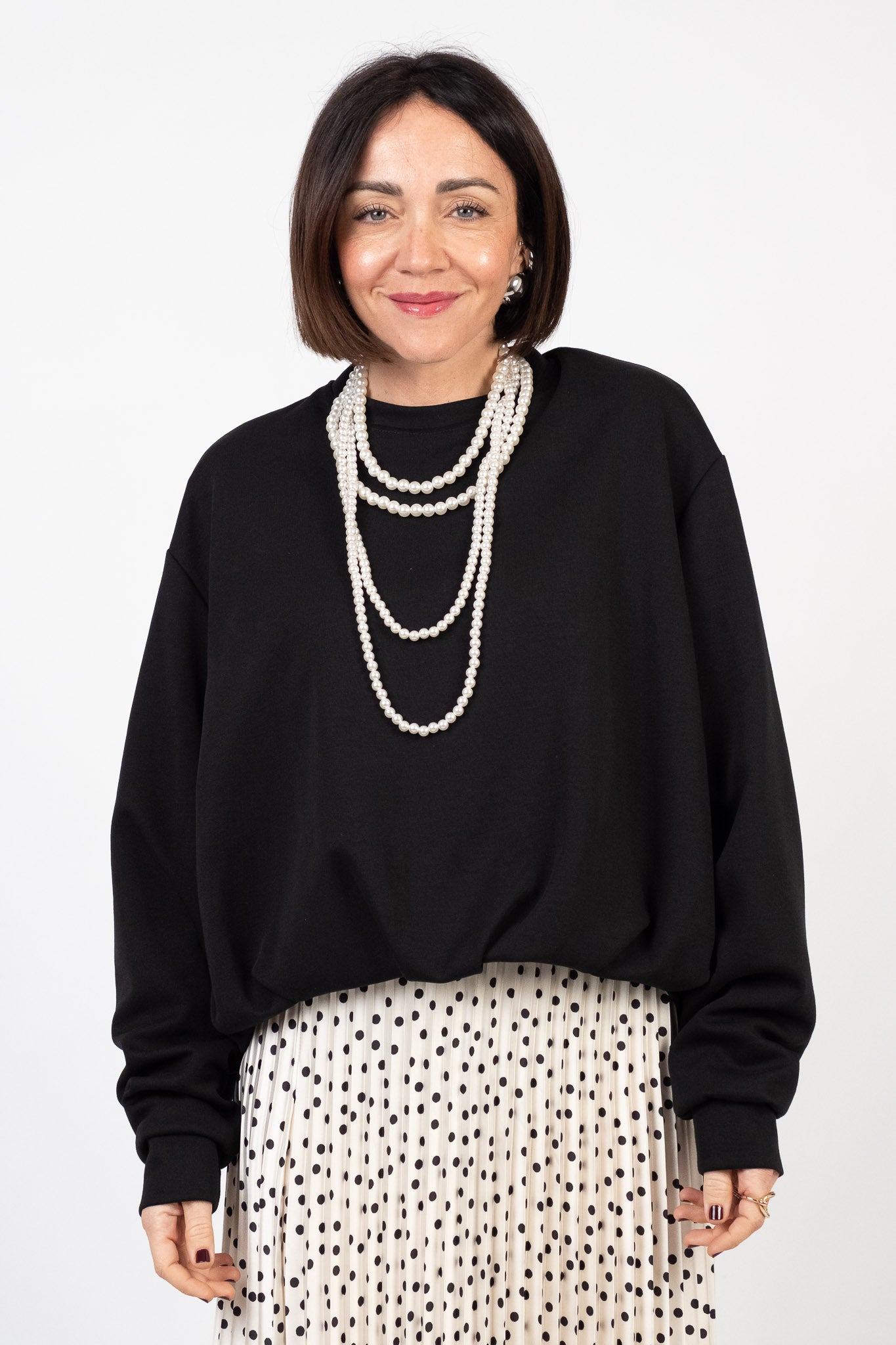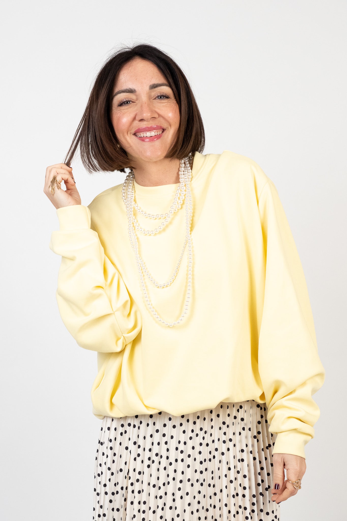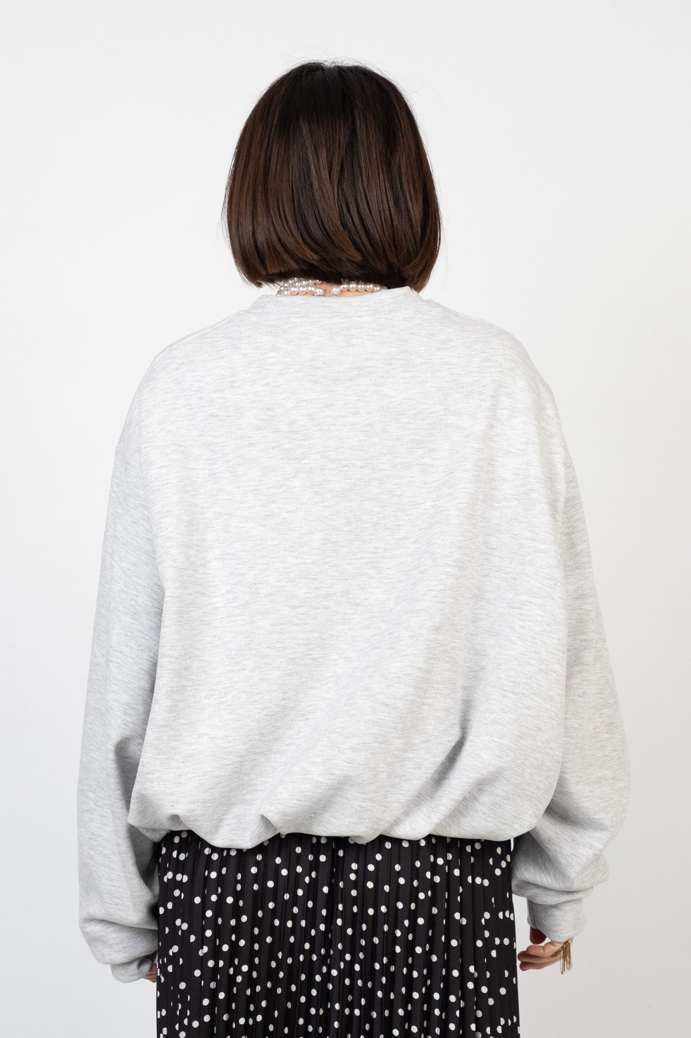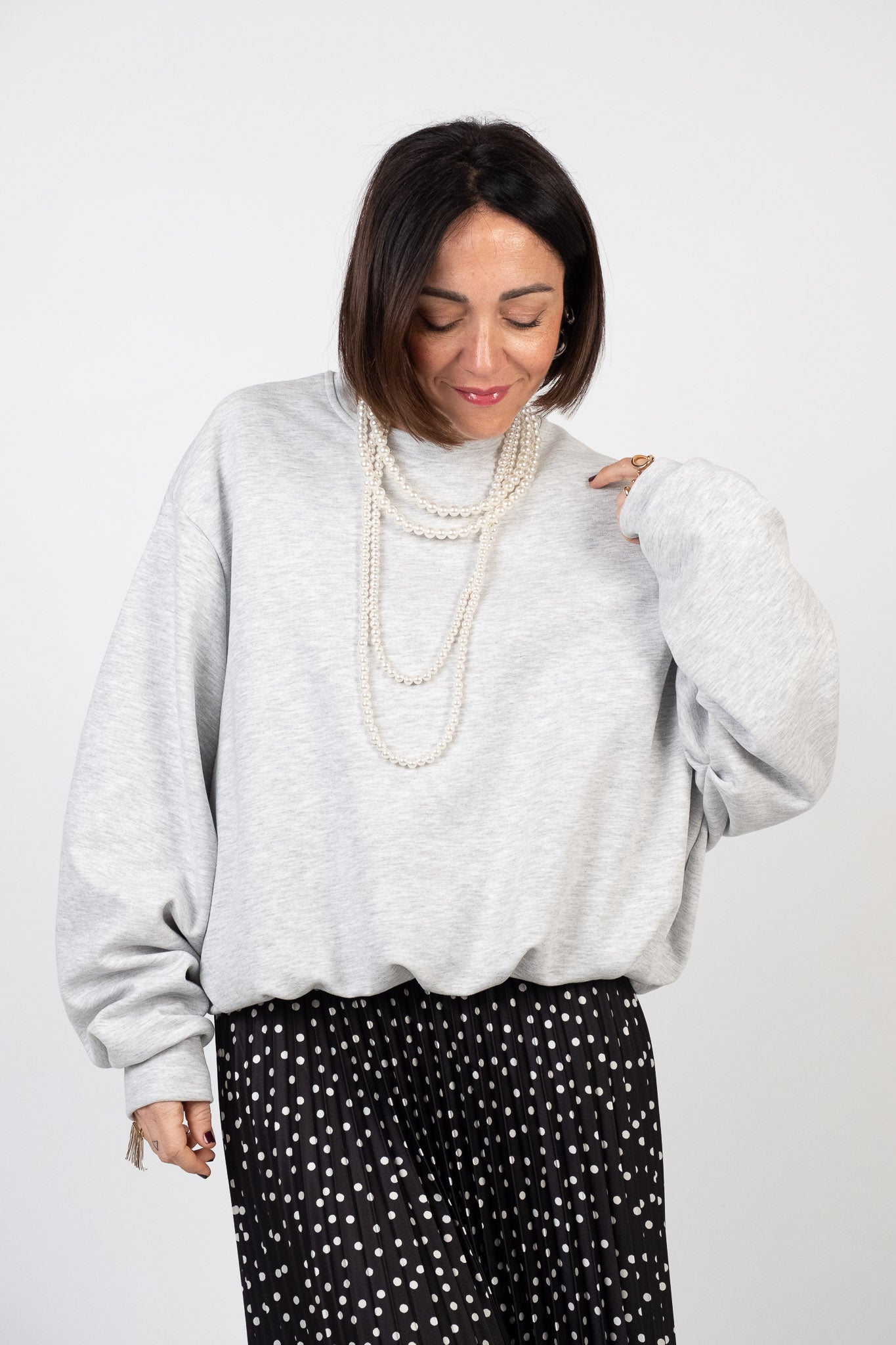 Felpa dal taglio over e volumi ampi con spalla scesa. Girocollo tondo e maniche lunghe che terminano con polsini lineari. Il fondo del capo è rifinito con un elastico interno che crea un'arricciatura fissa e un effetto rimborsato. Interno foderato. Tessuto elastico e di pesantezza media.