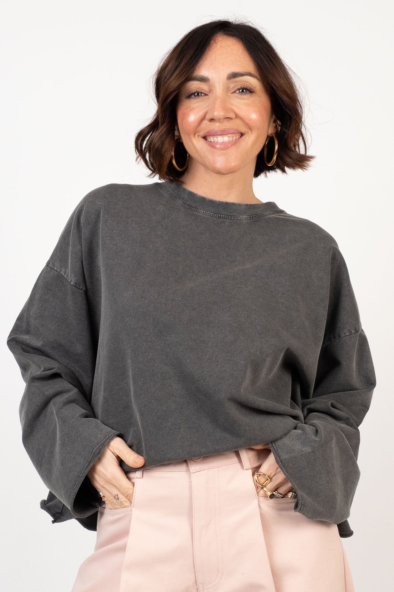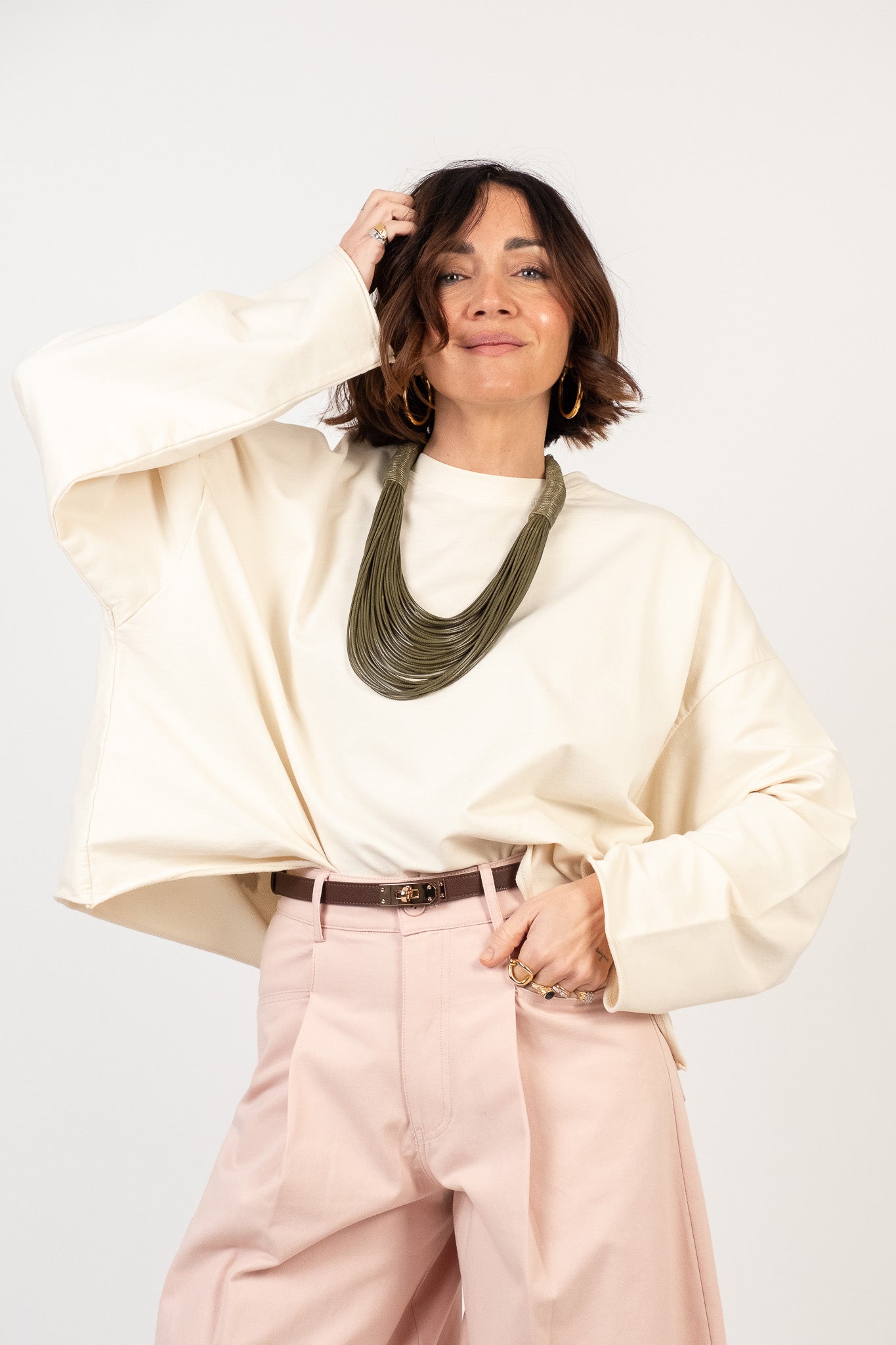 Lile's tip: abbina la felpa a un pantalone wide-leg o a una gonna in ecopelle. Gioca con gli accessori, come una cintura per dare un tocco di colore e riprendere il ricamo floreale.