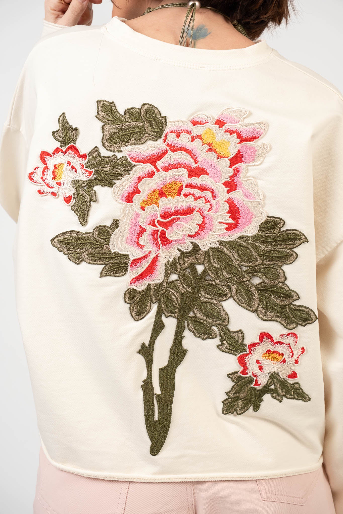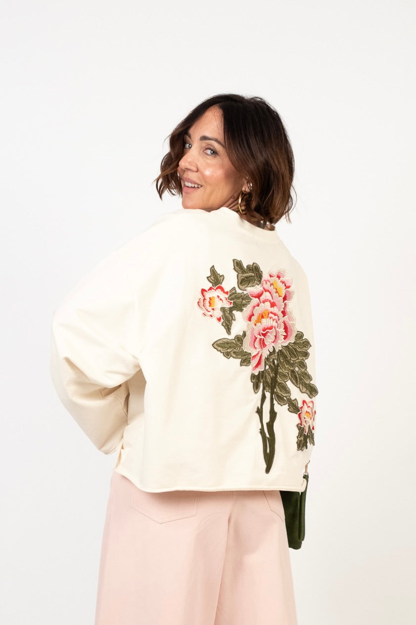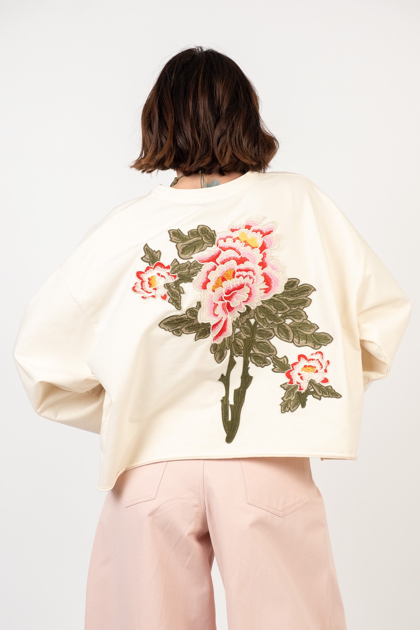 Felpa in cotone con ricamo floreale posteriore in rilievo. Collo rotondo a micro-costine. Vestibilità morbida e spalla scesa. Lunghezza crop con taglio vivo. Pesantezza media. Interno non felpato. Tessuto confortevole, non elasticizzato.