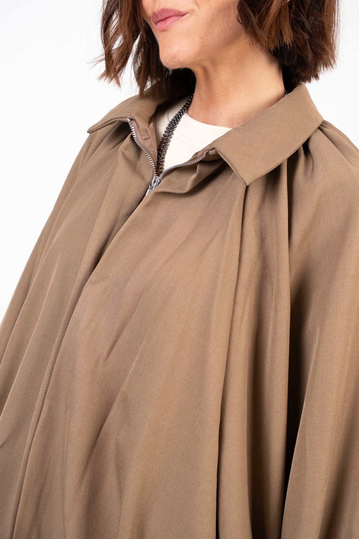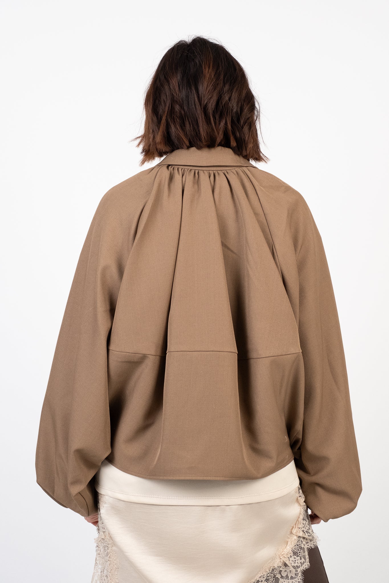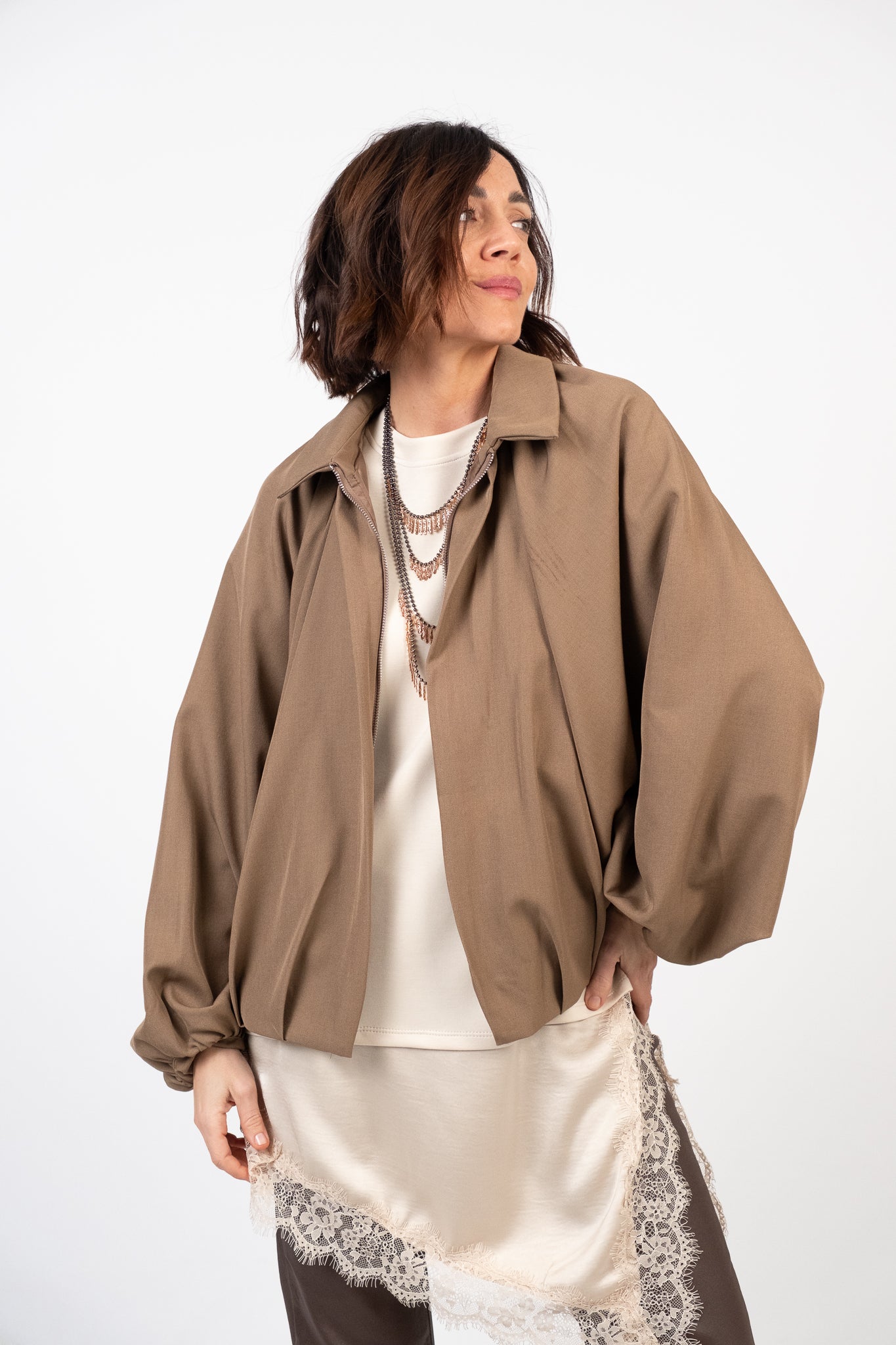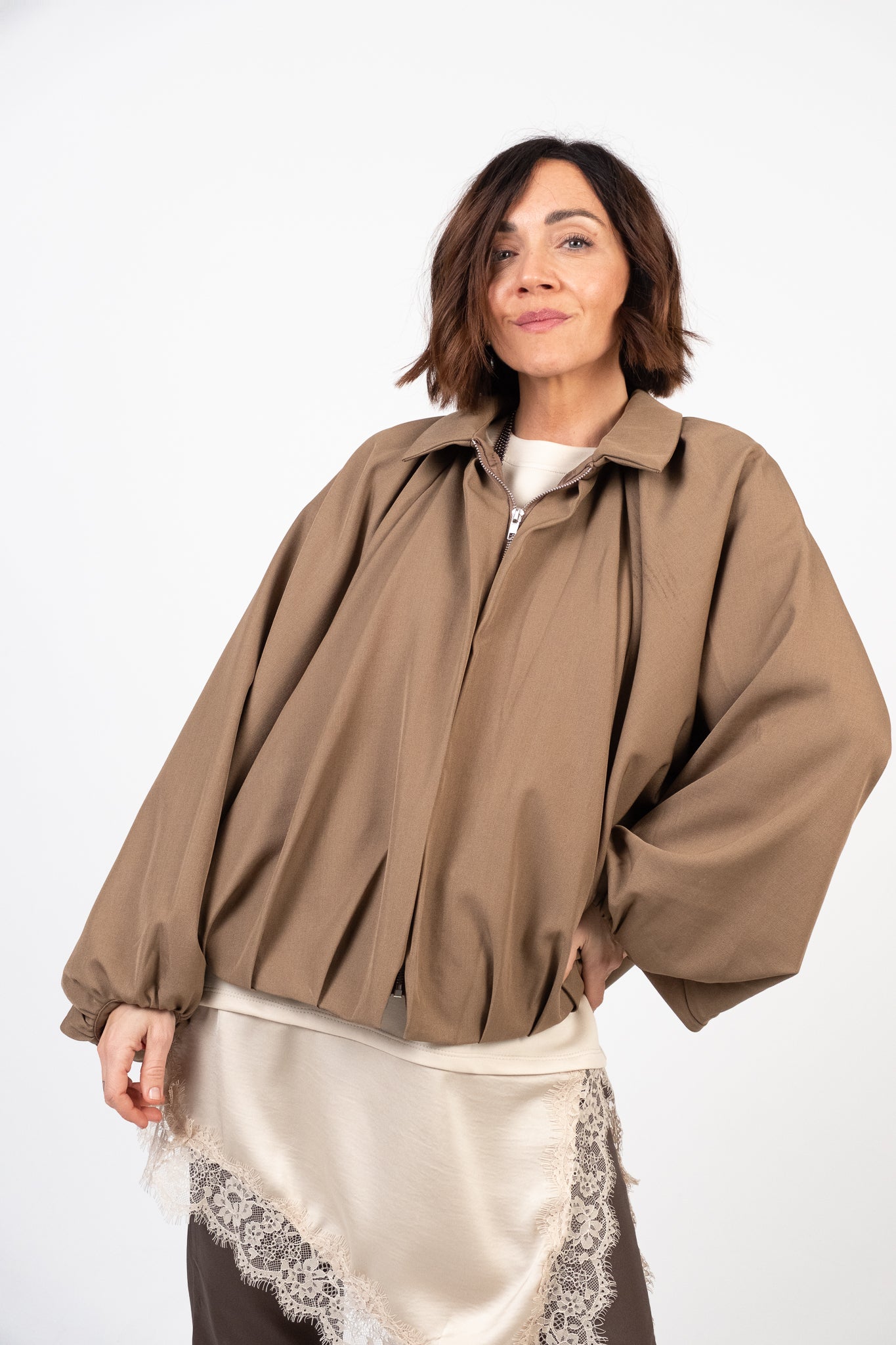 Giacca corta leggermente over. Manica ampia a pipistrello. Chiusura frontale con zip metallica a scomparsa. Colletto classico. Fondo arricciato che enfatizza il taglio bombato. Pesantezza media. Interno foderato. Tessuto strutturato, leggermente elasticizzato.