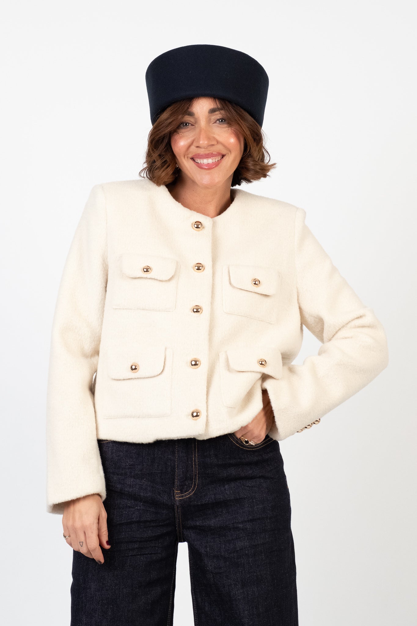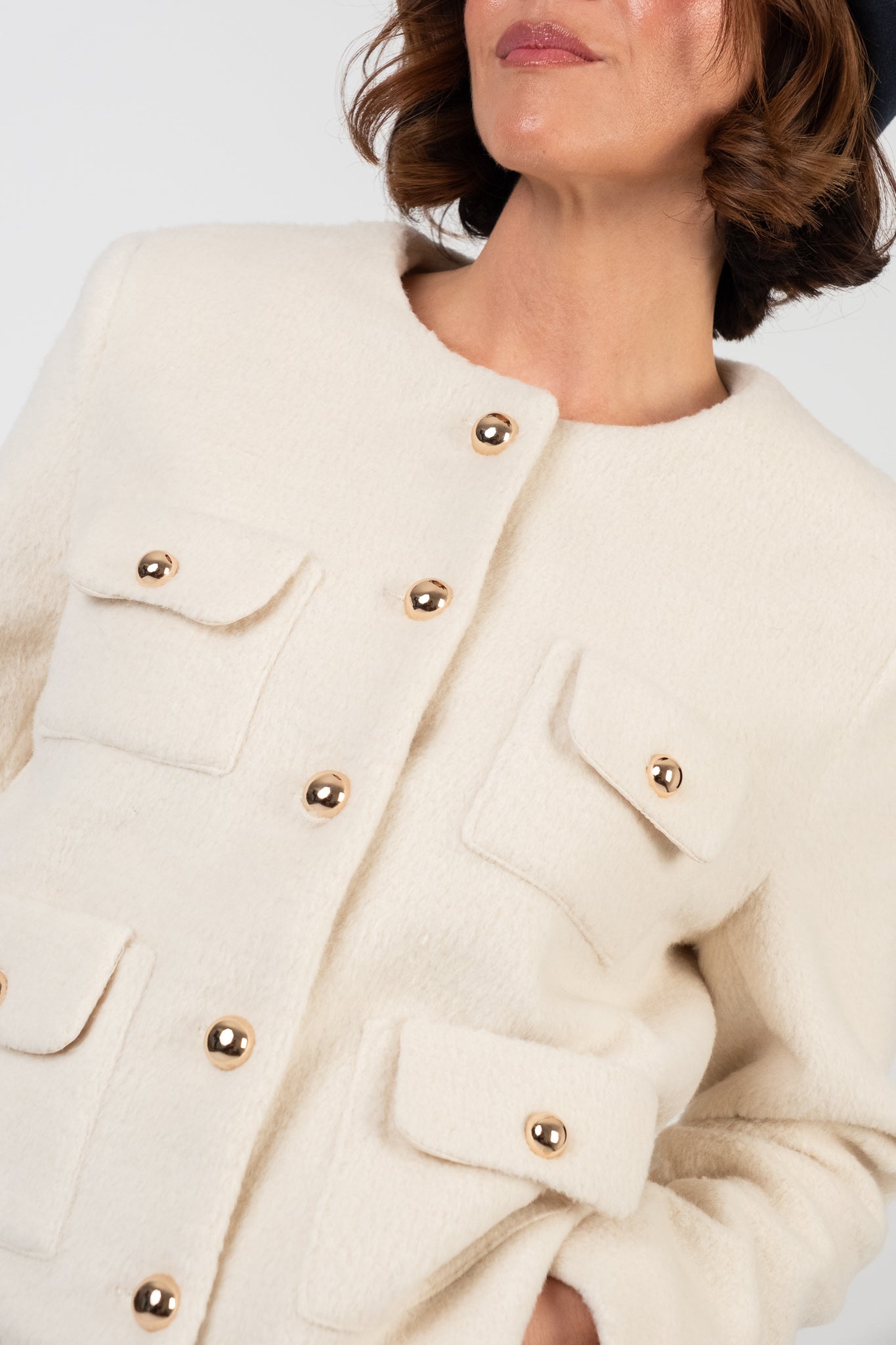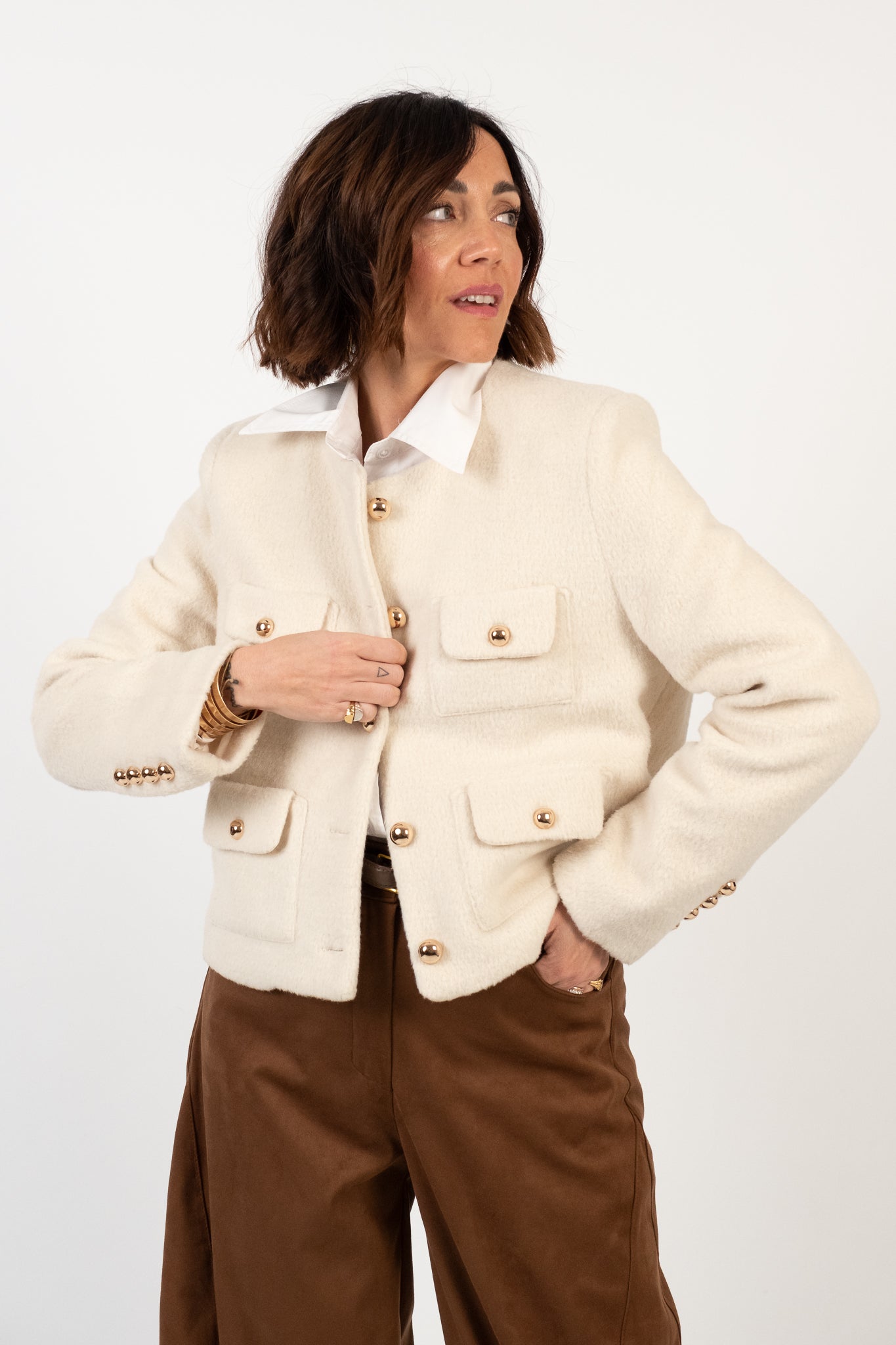 Giacca utility chic dal taglio strutturato. Chiusura frontale con bottoni gioiello dorati. Scollo regolare tondo. Manica con bottoni gioiello dorati. Vestibilità boxy con spalline delineate. Quattro tasche a toppa con bottone decorativo sul davanti. Pesantezza media. Interno foderato. Tessuto non elasticizzato. Lile indossa la taglia S.
