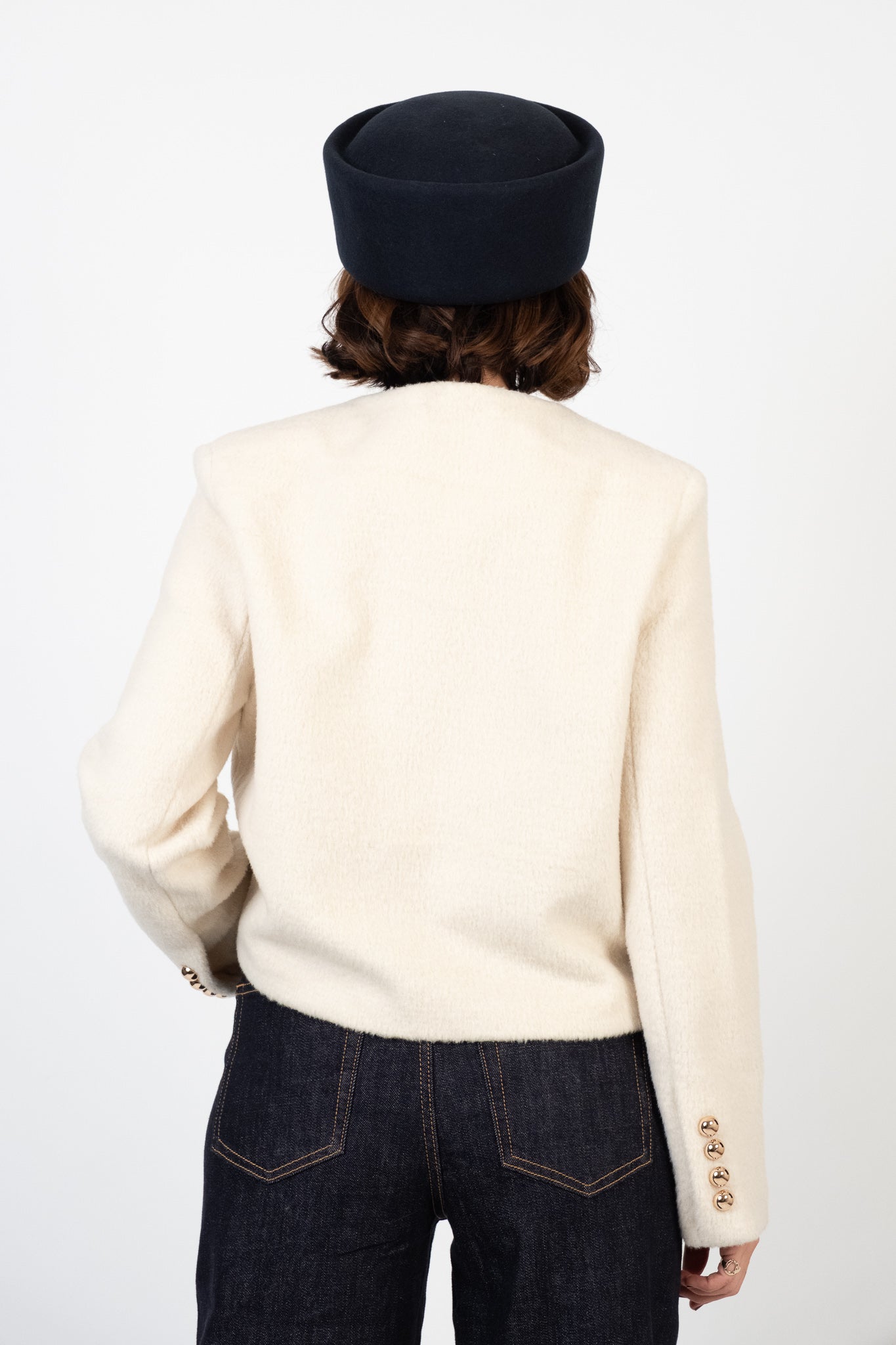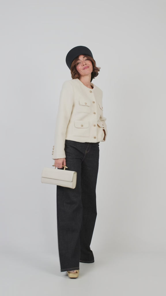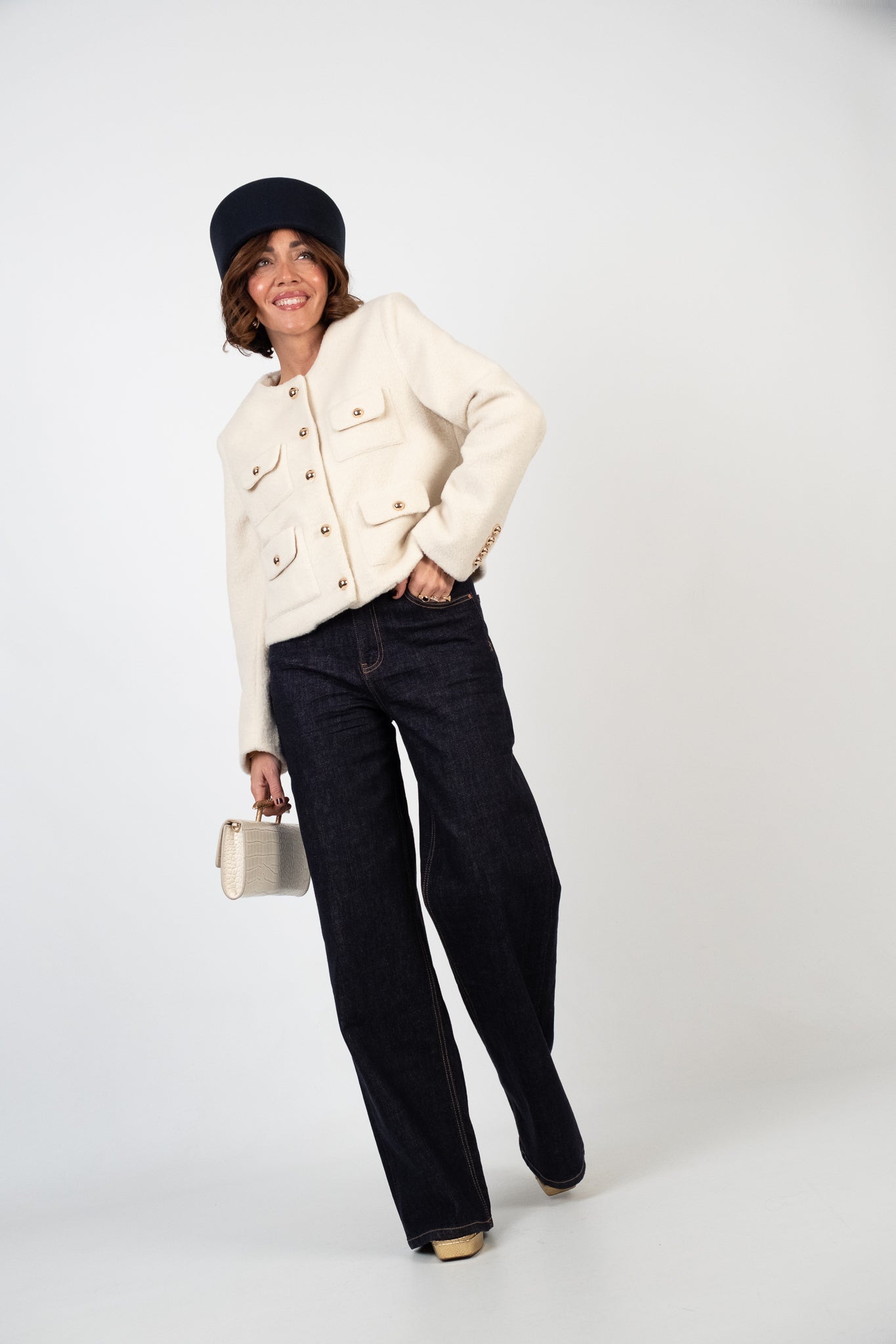 Giacca utility chic dal taglio strutturato. Chiusura frontale con bottoni gioiello dorati. Scollo regolare tondo. Manica con bottoni gioiello dorati. Vestibilità boxy con spalline delineate. Quattro tasche a toppa con bottone decorativo sul davanti. Pesantezza media. Interno foderato. Tessuto non elasticizzato. Lile indossa la taglia S.