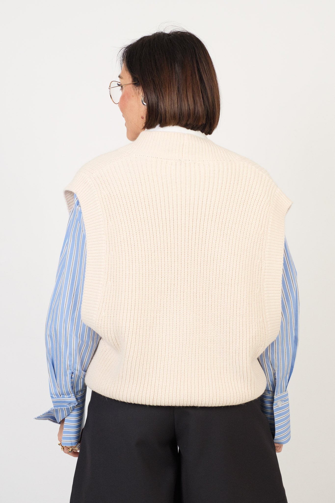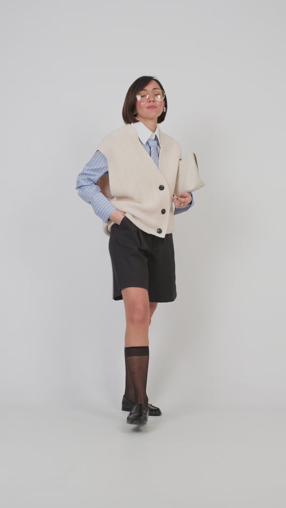 Gilet in maglia dalla vestibilità morbida e avvolgente. Scollo a V profondo. Chiusura frontale con bottoni a contrasto. Modello senza maniche con giromanica ampio, ideale per sovrapposizioni. Bordi a coste. Peso medio. Interno non foderato.