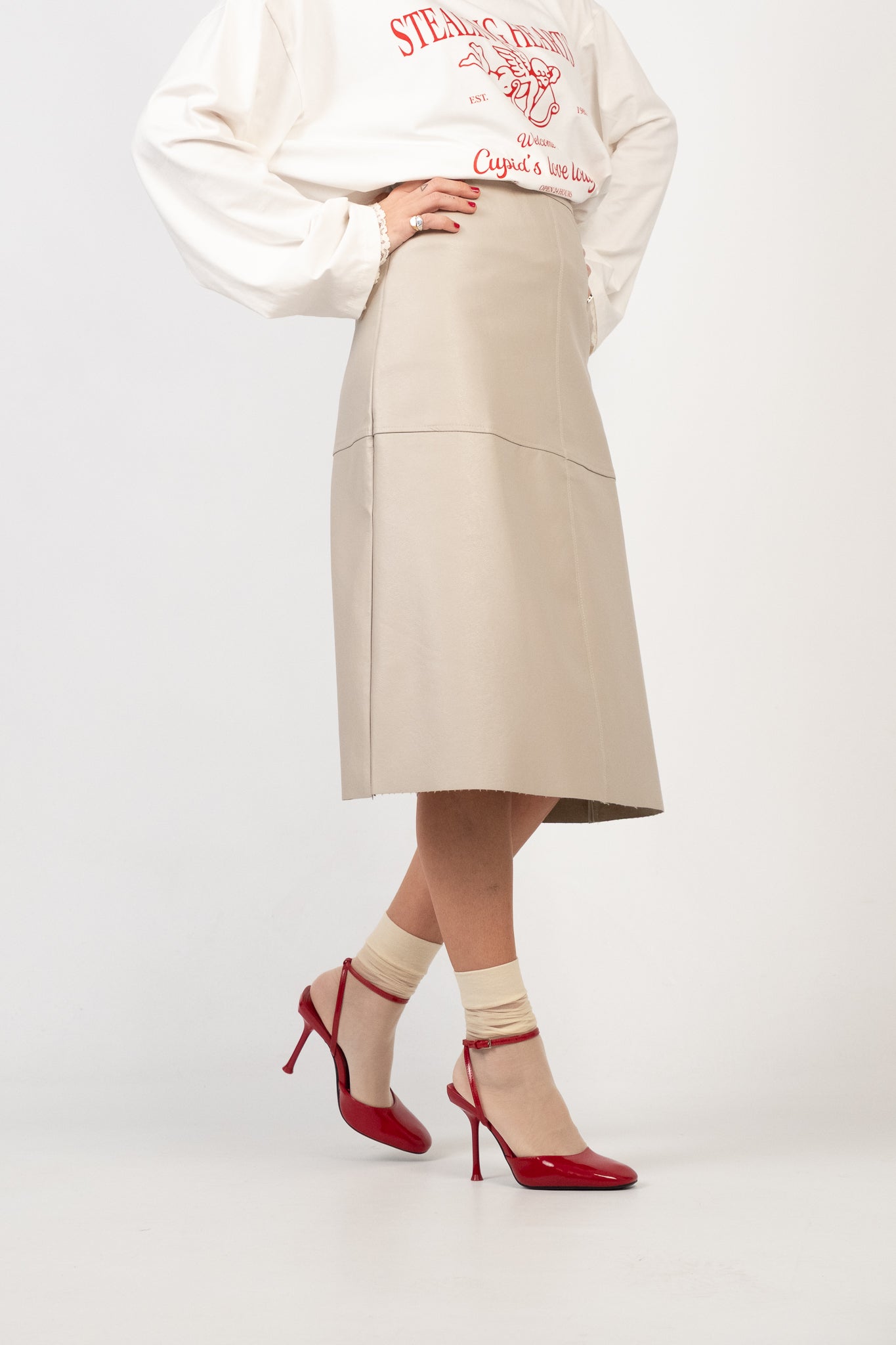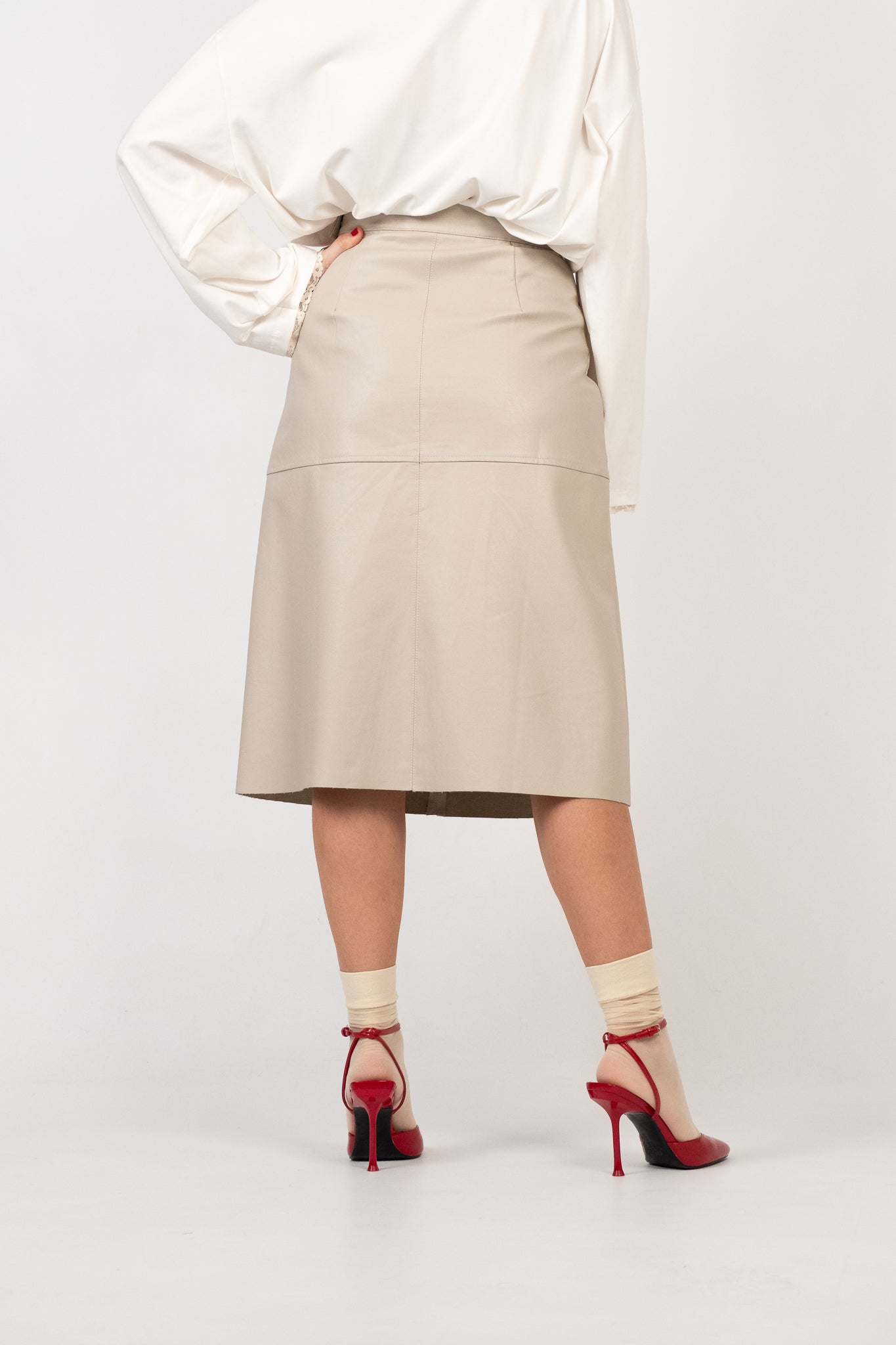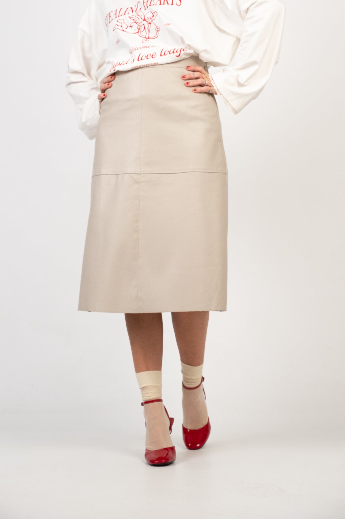 Gonna midi effetto pelle con cuciture a vista orizzontali e verticali. Texture opaca leggermente martellata. Taglio a vita alta che accarezza i fianchi e si apre dolcemente al fondo. Chiusura laterale con zip a scomparsa e bottone per un fit pulito. Lunghezza al ginocchio. Fondo a taglio vivo. Interno non foderato. Pesantezza media.