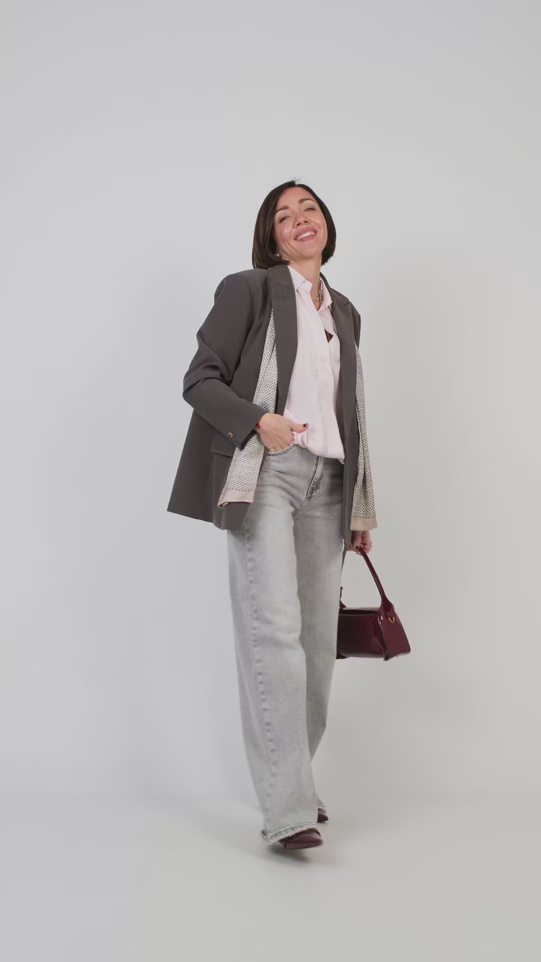 Jeans cinque tasche dal taglio contemporaneo. Linea wide-leg a tela ferma. Modello a vita regolare con chiusura zip e bottone in metallo, passanti in cintura e fondo gamba dal taglio vivo. Vestibilità comoda e strutturata. Lavaggio denim grigio chiaro.
