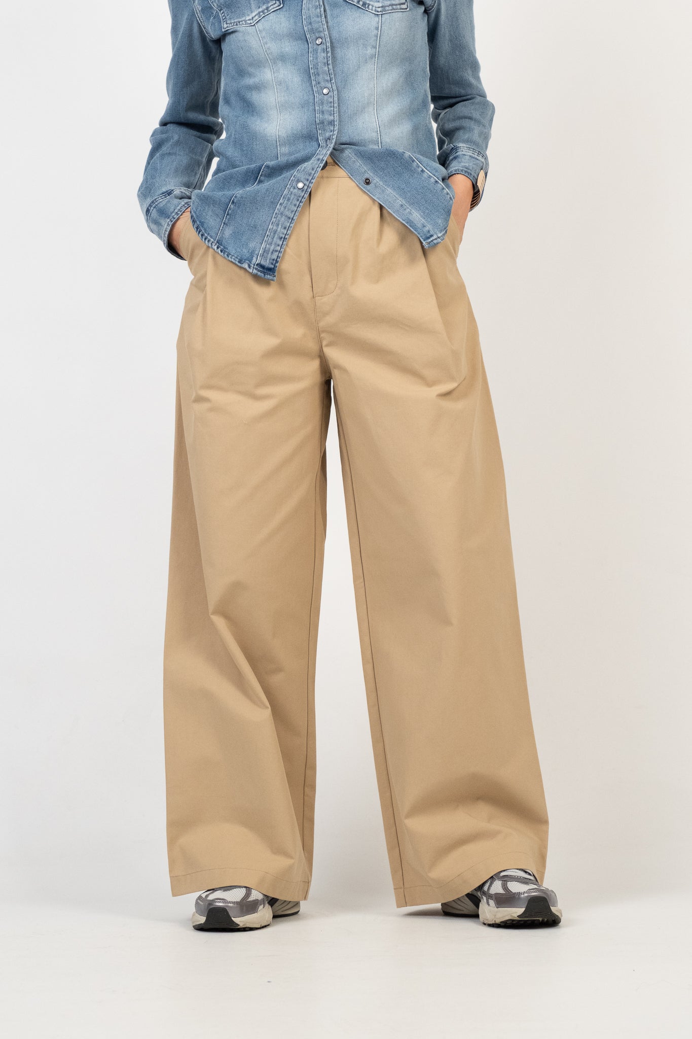 Pantalone ampio con tasche laterali in twill di cotone. La doppia pince frontale enfatizza la silhouette a palazzo. Vita alta con passanti. Chiusura a scomparsa con zip e bottone. Pesantezza media. Tessuto fermo e resistente. Lile indossa la taglia S.