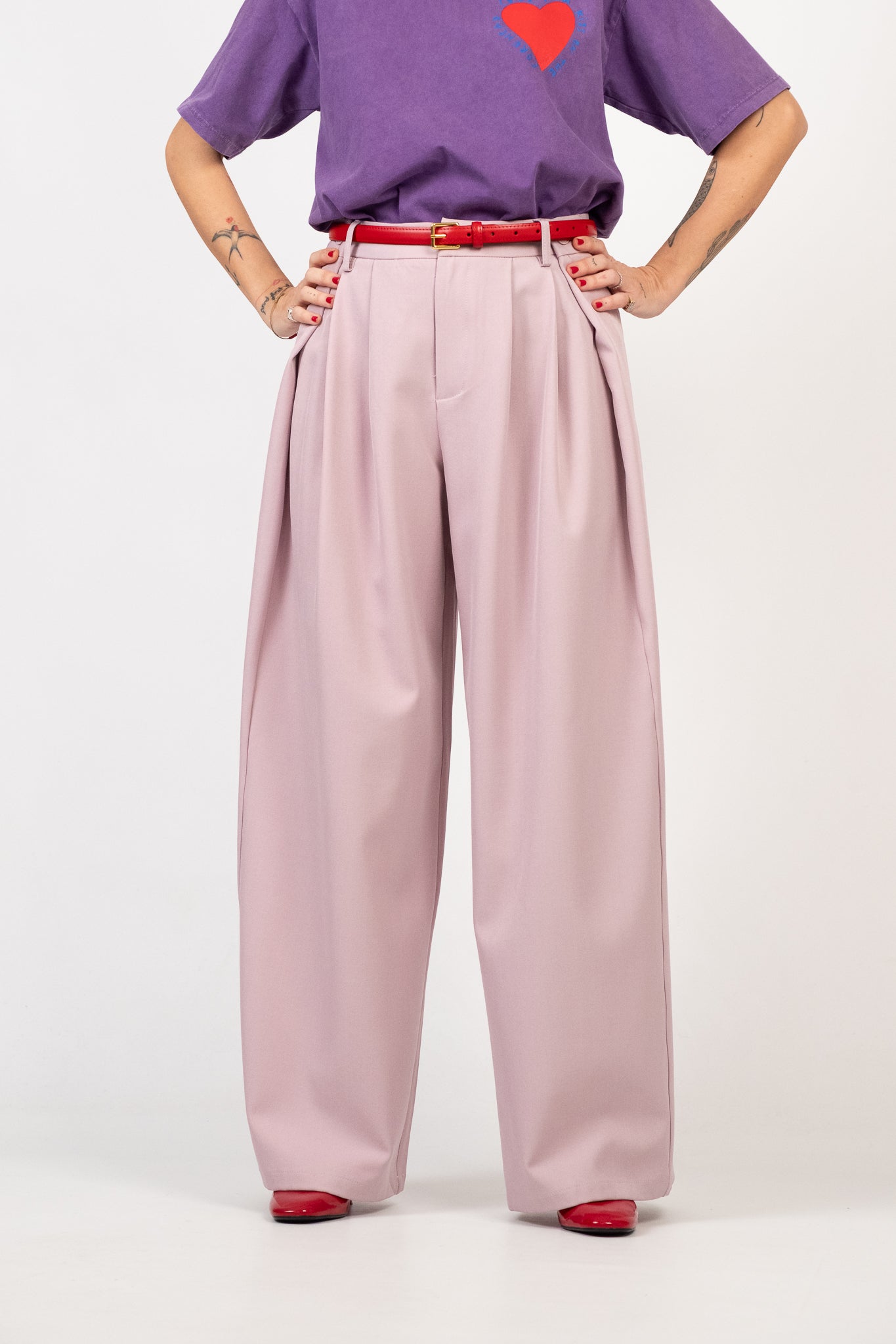 Pantalone a gamba larga in nuance pastello dal design contemporaneo con doppia pinces frontale. Vita alta definita da passanti sottili. Dettaglio bottoni tono su tono in vita. Taglio over e fluido. Vestibilità rilassata. Pesantezza media ideale per la transizione stagionale. Tessuto fermo dalla caduta impeccabile. Chiusura a scomparsa con zip e gancio. Lile indossa la taglia S.