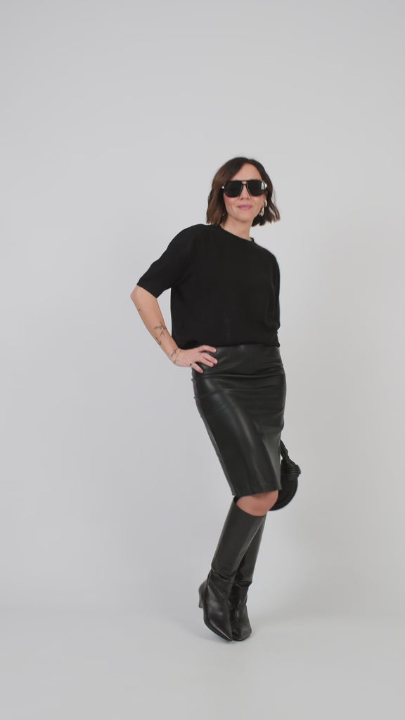 Pull a manica corta in misto viscosa e lana. Girocollo classico e rifinito a micro-coste. Fondo a costine sottili. Giromanica calato. Taglio regolare. Vestibilità rilassata e morbida. Pesantezza leggera. Tessuto confortevole e ultra-soffice, non elasticizzato.